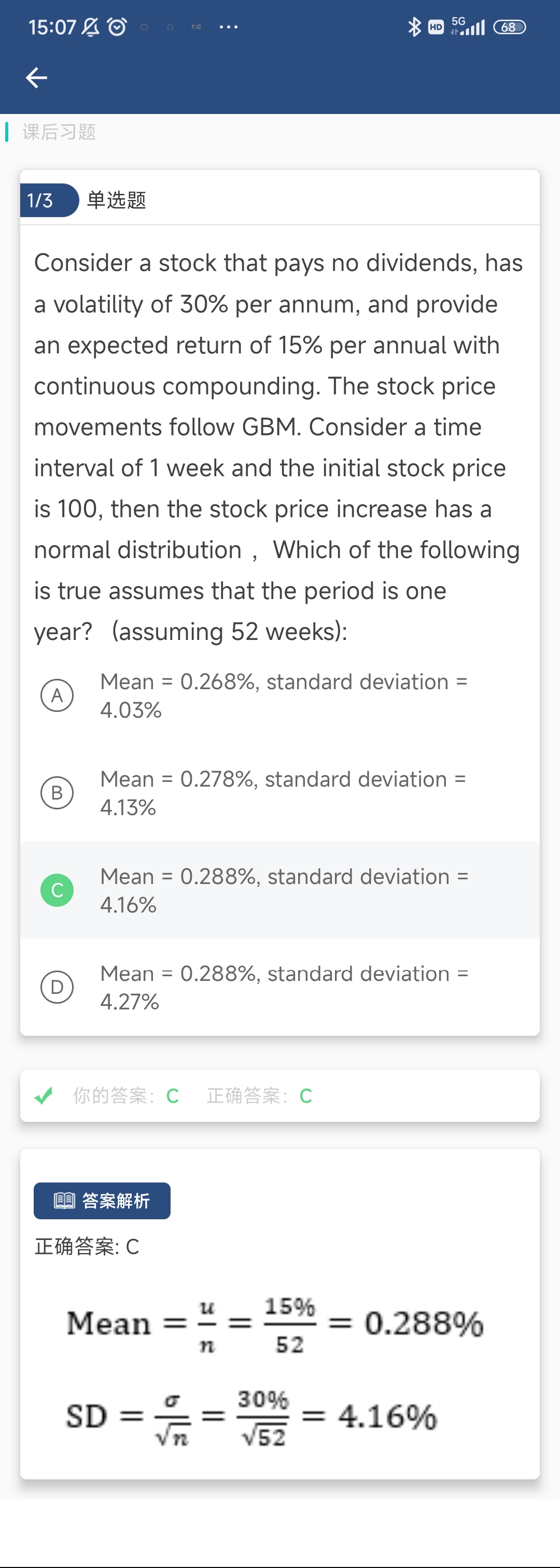 第一张图计算的是年化标准差转为每周的形式(题目里说了,1 week interval),第二张图计算的是方差开根号的标准差