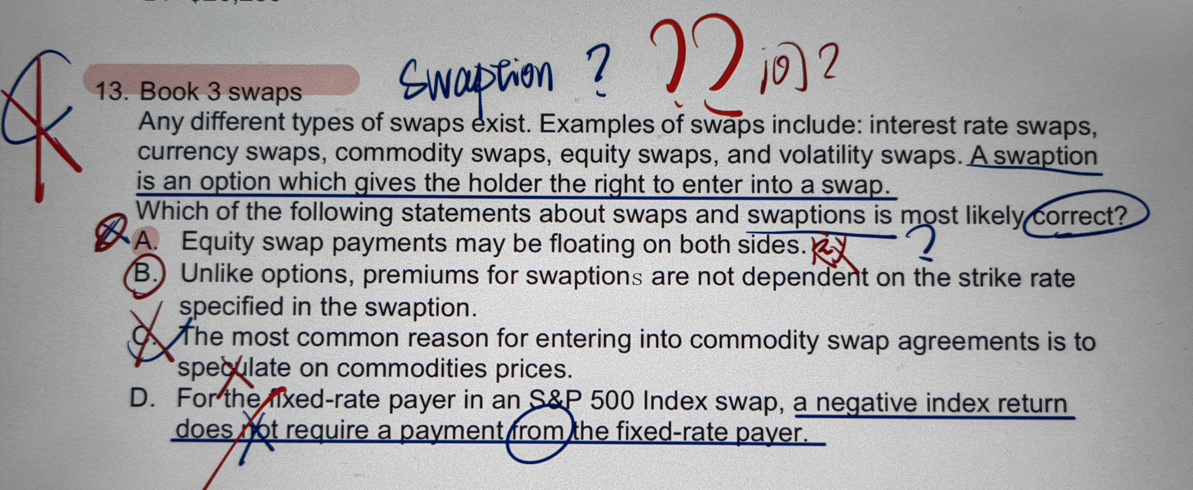 同学你好,Aswaption在金融市场产品科目,Aswaption是期权互换,即互换的标的资产是期权,所以行权价是会影响到互换价值的计算的,所以B错。