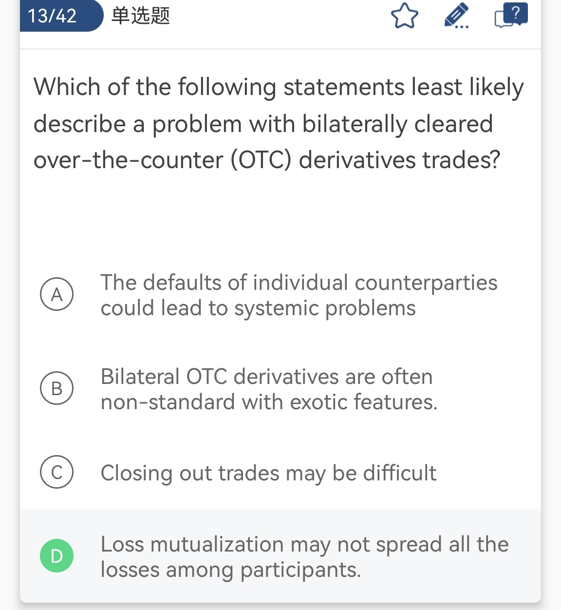 同学你好,场内交易有交易所充当最终的对手方,所以场内交易单个对手方违约不会导致系统性风险。