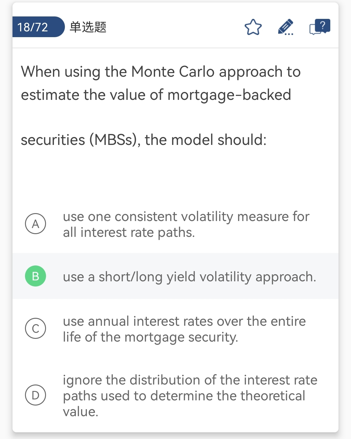 同学你好,蒙特卡洛模拟的基本逻辑就是模拟不同利率情况下的价格路径,同时还要考虑到MBS价格波动率的情况,期限不同,波动率也会发生变化,也就是B选项长期或短期波动率情况;而C选项错在整个MBS生命周期当中都是使用年化利率,它的意思是这个利率是不变的,所以是错误的。