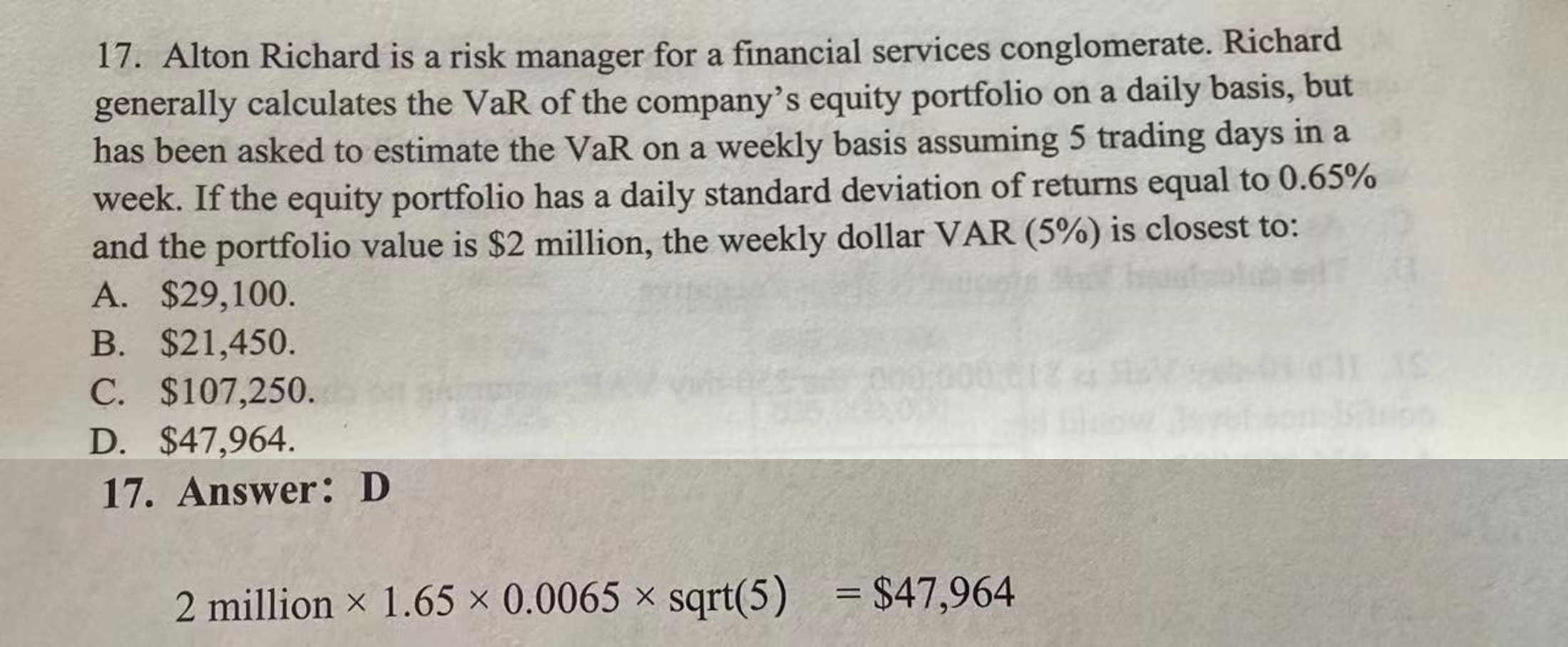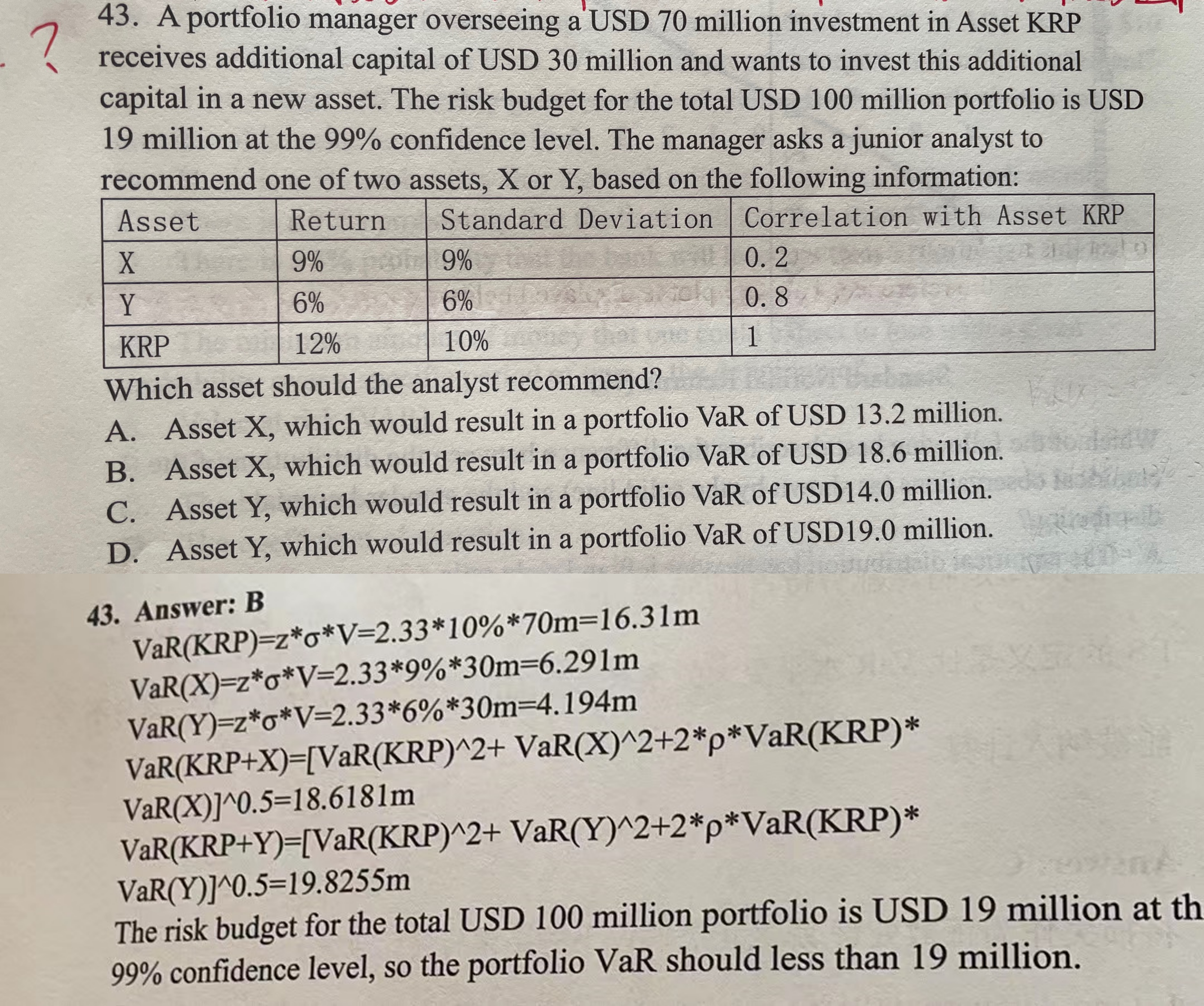 这道题有点不符合常规,建议跳过。正常情况下,计算组合VaR的方式由两种,一种是先用加权平均法计算组合收益均值,然后计算组合标准差,最后利用VaR计算公式:u-z西格玛计算出组合VAR,这种情景适合资产收益均值不为零的情况;如果组合收益均值为零,则可以先计算单个资产的VAR,再利用组合VAR的公式计算组合VAR,当然也可以用第一种方法;