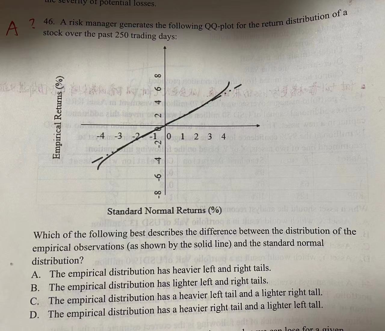 同学你好,简单的判断方法就是斜率大的曲线是肥尾(就如题目图中的实线),斜率小的就是瘦尾,课程种老师讲的“正态分布走2个标准差、未知分布走4个标准差的情况下说明在统一置信水平下,未知分布相比于正态分布的VAR值更大,所以更加肥。