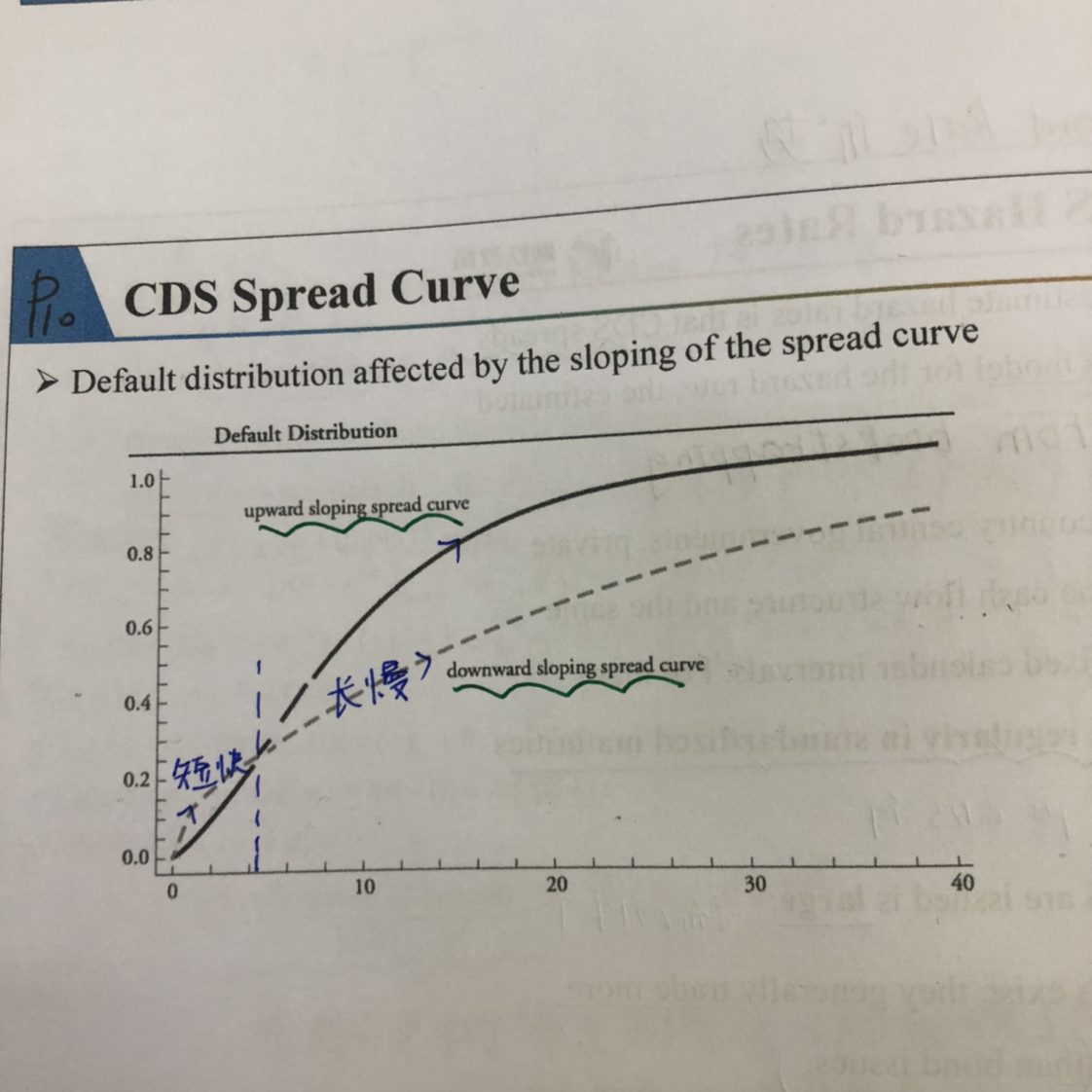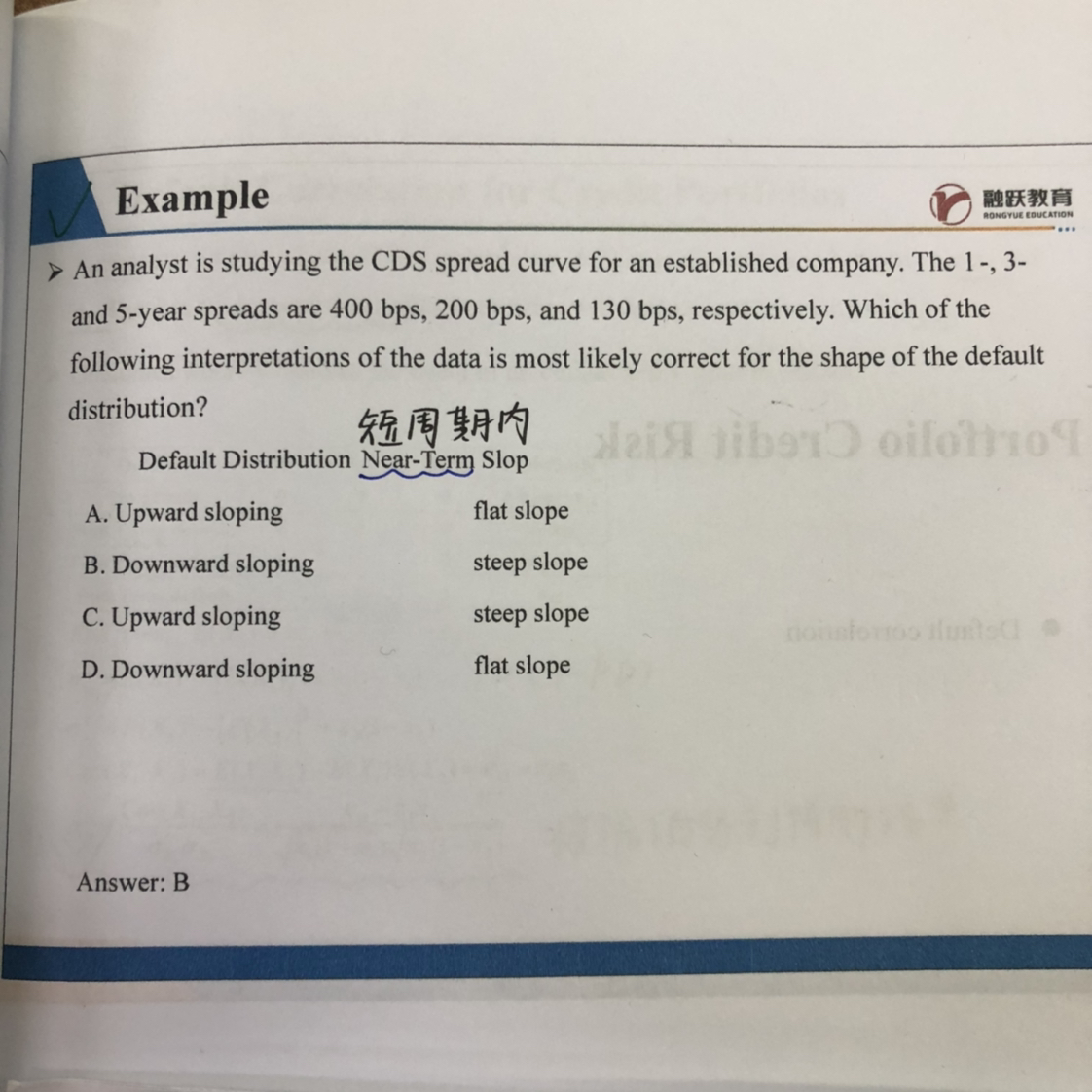 同学你好,老师在课程上特别提示这里的default distribution指的是CDS spread curve,而不是累计违约概率分布,所以是下降的,老师选B的目的是说考察累计违约概率总是上升的概率比较小,但是根据题目考察的确实是累计违约概率,如果考试考到这道题,以C选项为准。