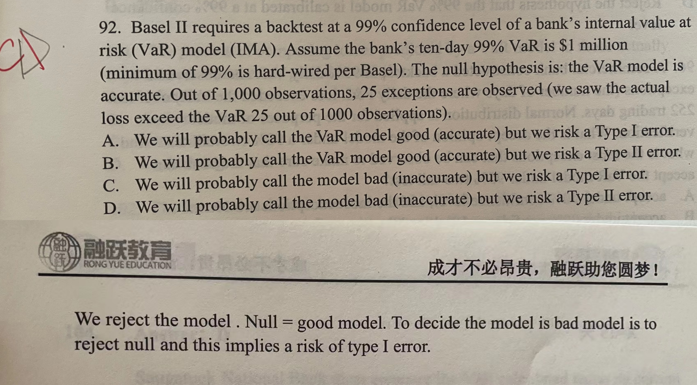 同学你好,第一个问题,是的;第二个问题,如果原假设是真的,我们拒绝了原假设,此时就会面临着有1%的概率把好的模型给拒绝了的风险,即一类错误。
