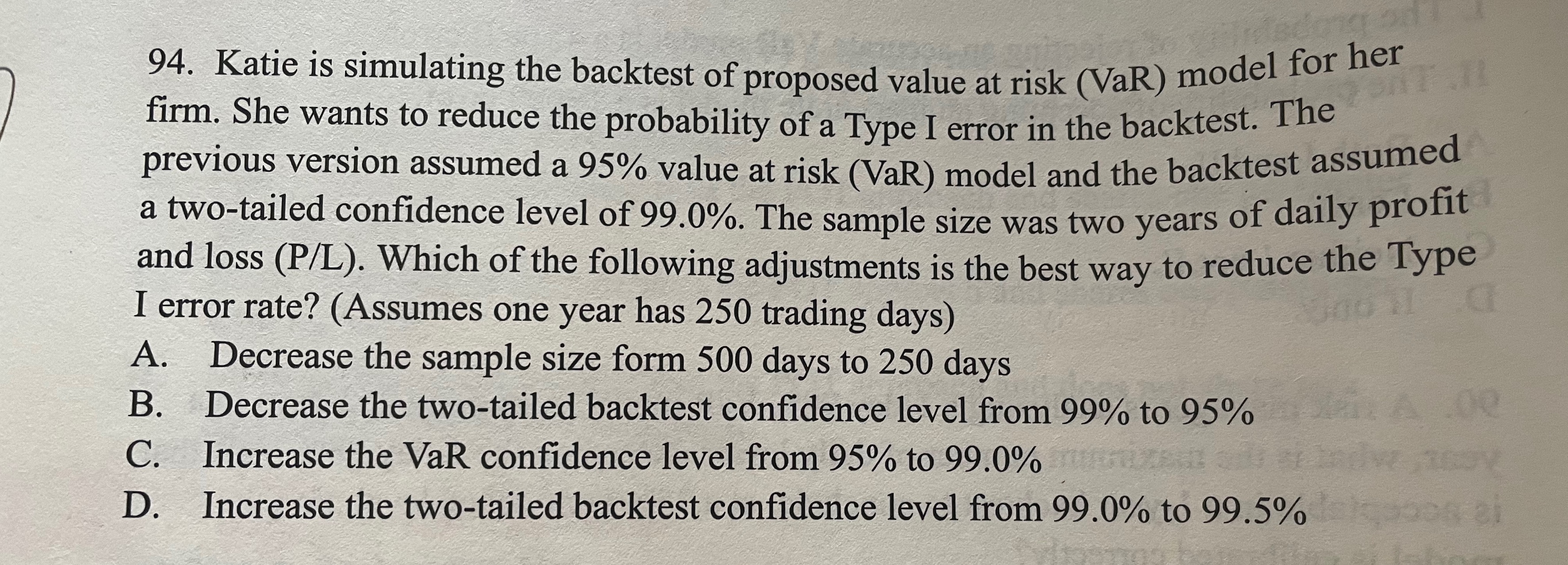 同学你好,这道题考察的就是一类和二类错误,sample size增加可以同时降低一类和二类错误,反之则增加一类和二类错误;backtest confidence level增加,显著度水平下降,所以可以降低一类错误(=α);var confidence level增加则理论上的异常值变少,则回测统计量分子(实际异常值减去理论异常值)变大,更加容易拒绝原假设,即一类错误上升;