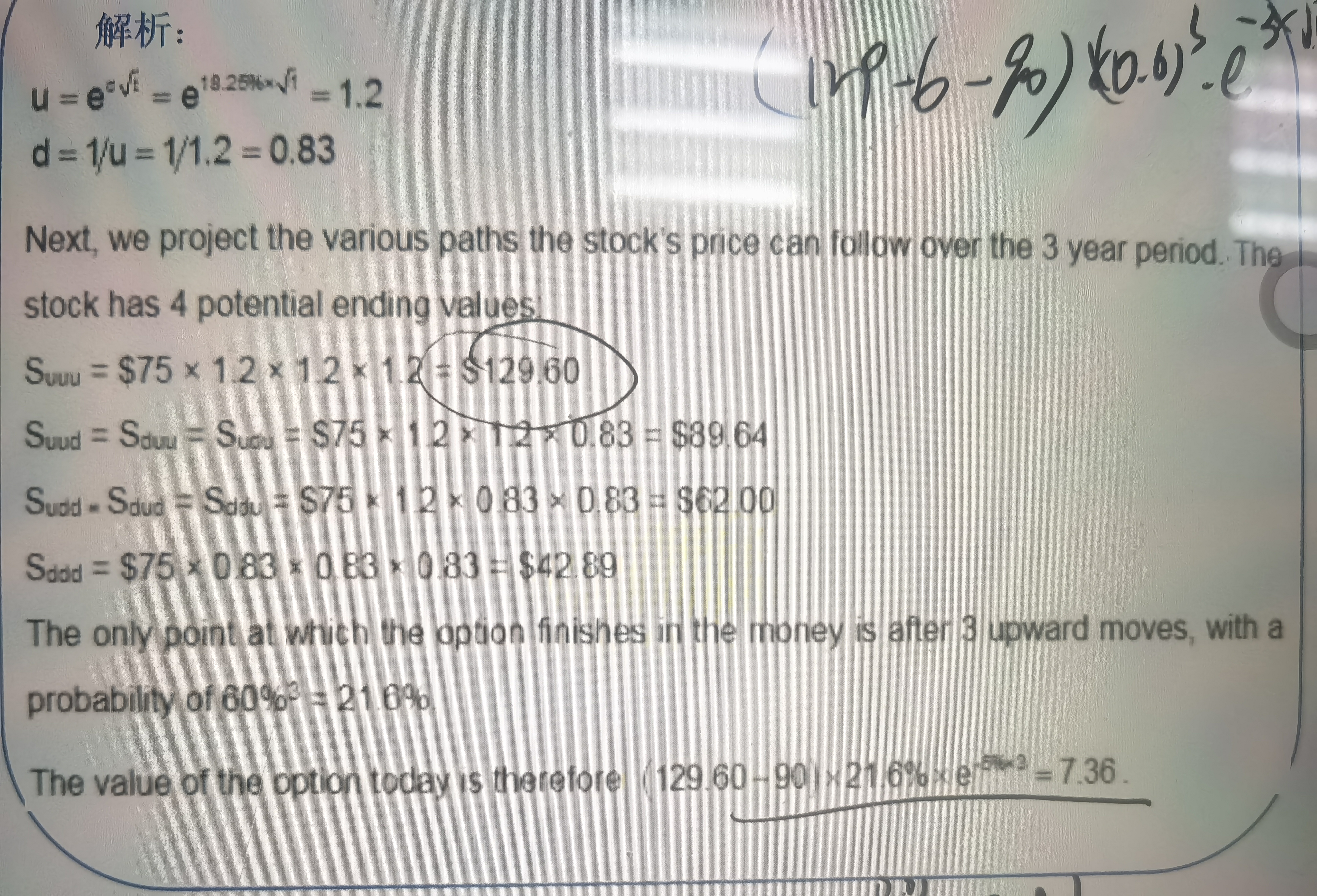 同学你好,这道题的易错点是最终计算的概率应该是风险中性下的上涨概率,而不是题干中给出的60%,只不过这道题通过计算出来的风险中性上涨概率恰好等于60%,如果题干给出上涨概率不是60%的话,如果你直接用了就会导致计算错误。