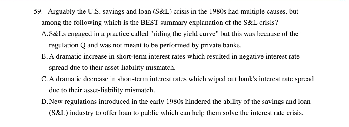 riding the yield curve和监管Q,都是促进储贷行业发展的,所谓riding the yield curve其实就是借短投长,监管Q对存款利率的上限有了约束,总结起来,对于银行来说,就是压低了成本(给储户的利息),放大了收益(收取贷款的利息)。这个是促进储贷行业发展的。题目问的是导致储贷行业出问题的原因,主要是短期利率的飙升,导致原本的利差被抹平,储贷行业为了盈利,降低了信贷标准