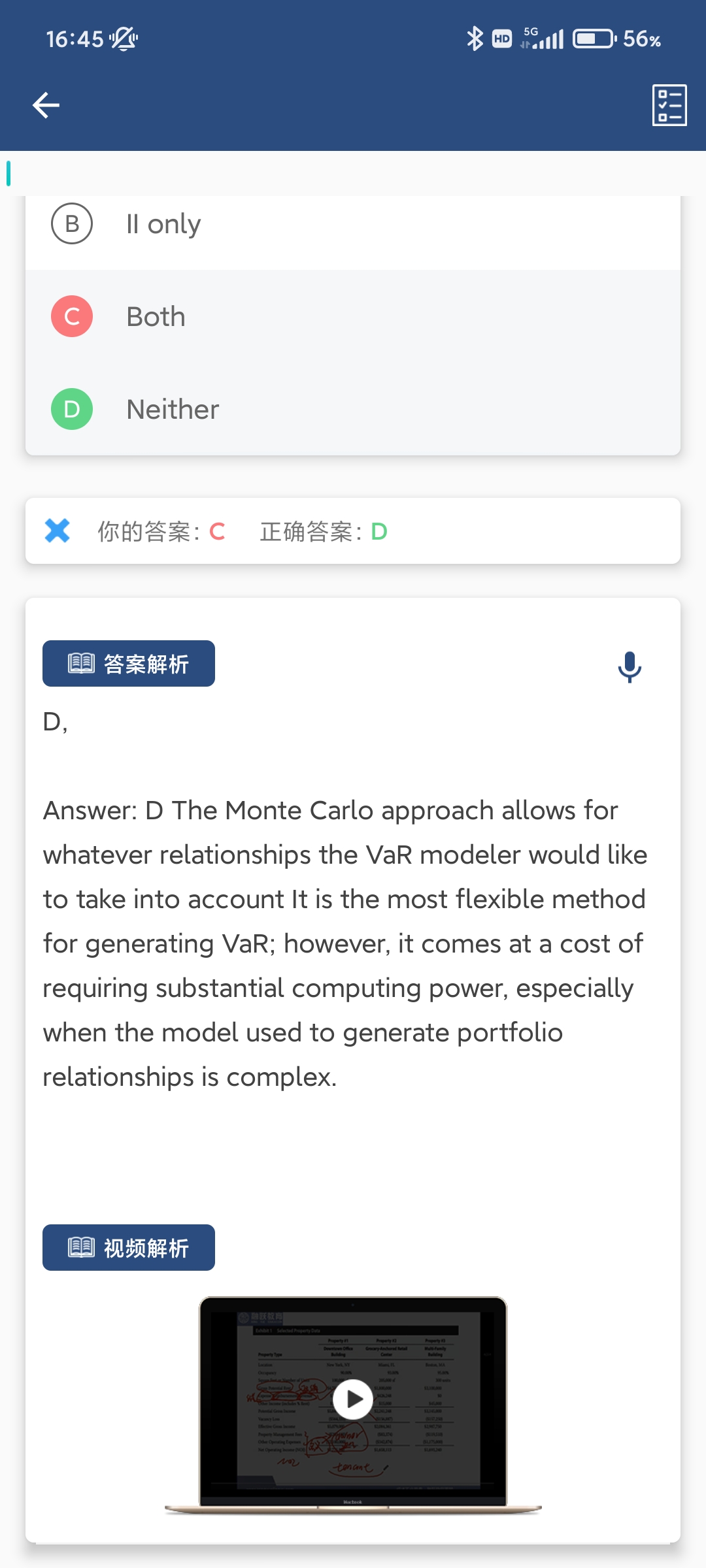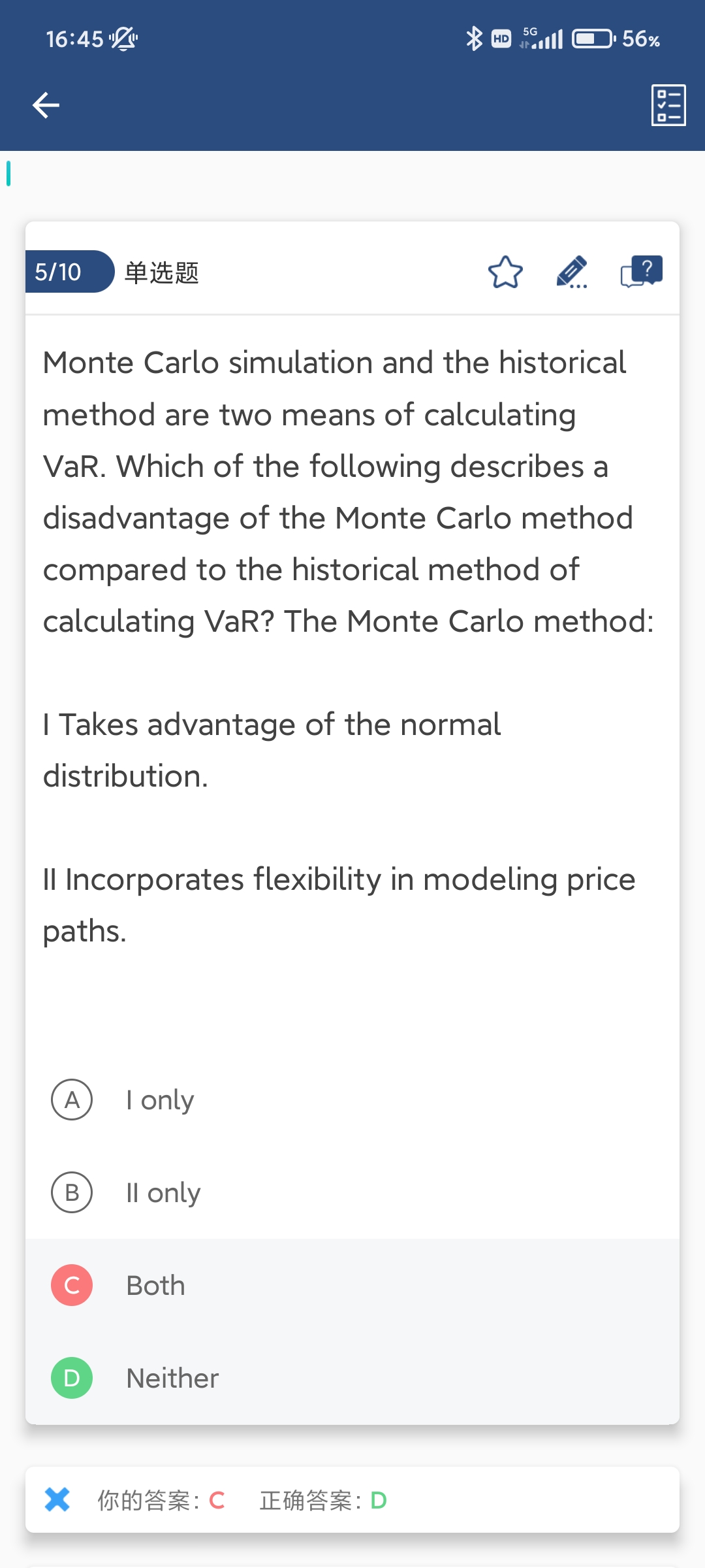 第二句话描述的是蒙特卡洛的优点,但是题目让你选的是蒙特卡洛相比历史模拟的缺点。