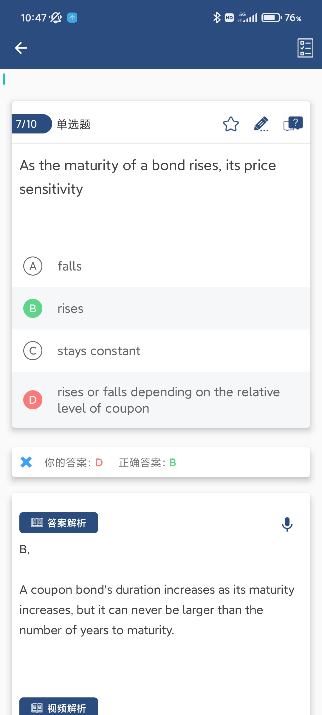 他给你的影响因素是随着期限的上升,久期会怎么变。所以这道题主要想考核的是到期时间和久期之间的关系,是单一影响因素的考核。如果加入了coupon的考量,那么就成了多因素的影响,既要考虑期限对久期的影响,也要考虑coupon对久期的影响,并且最终的影响程度,是要取决于期限和coupon谁的变动对久期的影响程度更大的。考虑这种多因素的复合影响,难度已经超出的FRM的考纲范畴。而且D选项的描述,即便非要去钻这个牛角尖,它的说法也是有问题的,D选项说的是,随着债券的期限上升,价格敏感度的上升或下降取决于息票的相对水平。如果说,期限的影响已经远超过coupon的影响,那么coupon的变动将不足以对债券的久期带来什么影响。不知道你能不能理解我所表达的意思