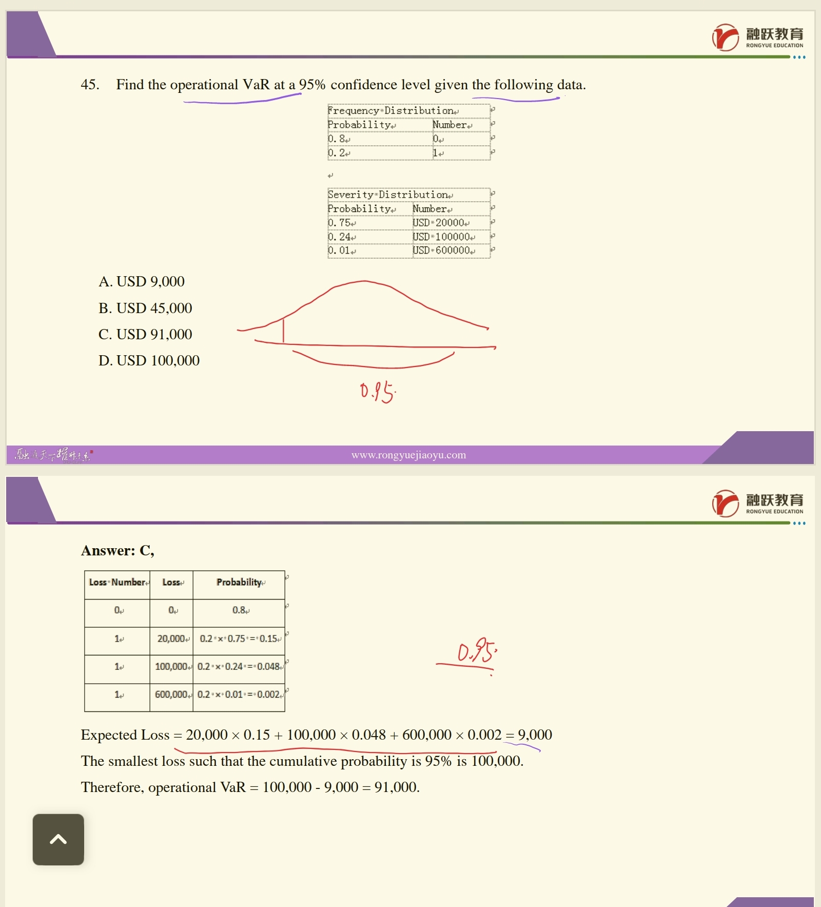 首先,这个题出的不好,95%的分位点,对应的的确是20000,但是,在20000这个点上,是没有对应答案的,而且非常巧的事情是什么呢,这个95%的分位点,恰好在20000和10000的分界上面,所以,不严谨的说,既然是分界点,那么你用20000和10000是都可以的,但是严谨的来说,应该用20000,考试不会有这种问题,请放心。其次,为什么要减去预期值,原因很简单,VaR算的是一个分位点损失,针对VaR我们可以计提经济资本,从而覆盖非预期损失。那么非预期损失对应的部分,就是VaR这个分位点的损失和预期损失之间的差额。所以这里计算Op。VaR,其实算的是需要覆盖非预期损失的经济资本。就好比在Vasicek模型当中,我们用(WCDR-PD)*LGD*EA去计算Credit risk VaR一样。表达成VaR,实则算的是需要多少经济资本去覆盖非预期损失。建议不要去硬记某一个指标是什么意思,要去理解这个指标的表达。我们引出VaR其实就是为了更好的度量非预期损失,度量非预期损失的目的是为了准备好EC去覆盖非预期损失,所以,很多时候,VaR和EC在计算上是不明确区分的,因此,我们也把VaR称为EC method,这个我在冲刺课上有提到