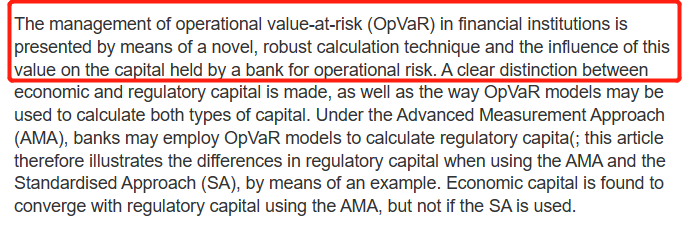 你这么理解,没有什么问题。你看我下面的这个截图,这个截图来自一篇研究Op.VaR的论文,他首先就强调了,操作风险VaR的计量,主要是用于资本金的计提上。所以你关注的是VaR本身的定义,那么D选项没错,但是关注的是应用,那么实则就是在计量capital,capital用于覆盖非预期损失,非预期损失就是VaR这个分位点对应的损失和预期损失之间的缺口,所以题目是从应用维度出发,你是从VaR基本的定义出发。