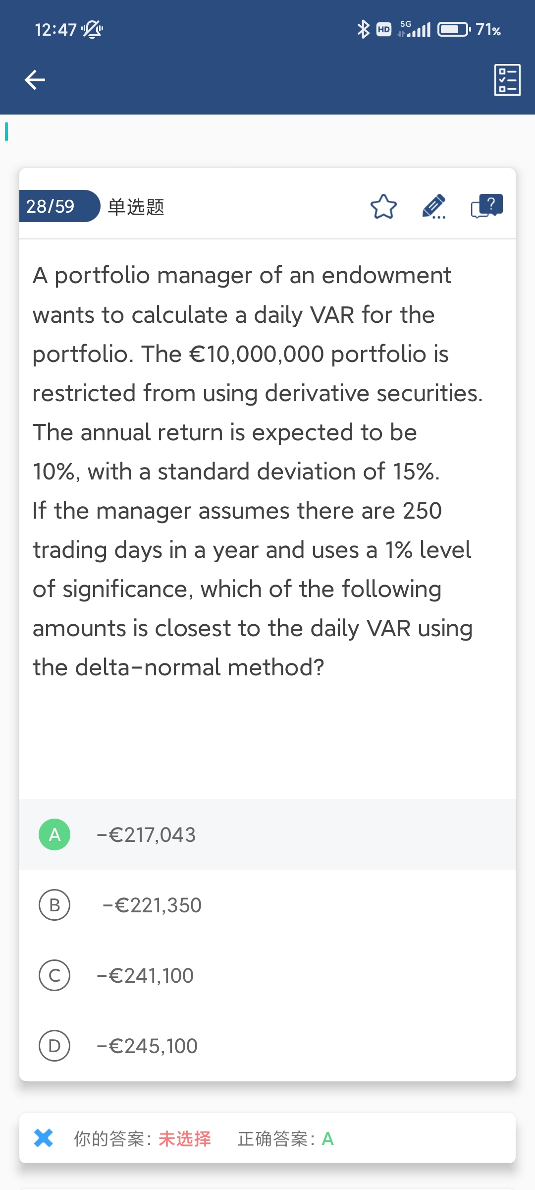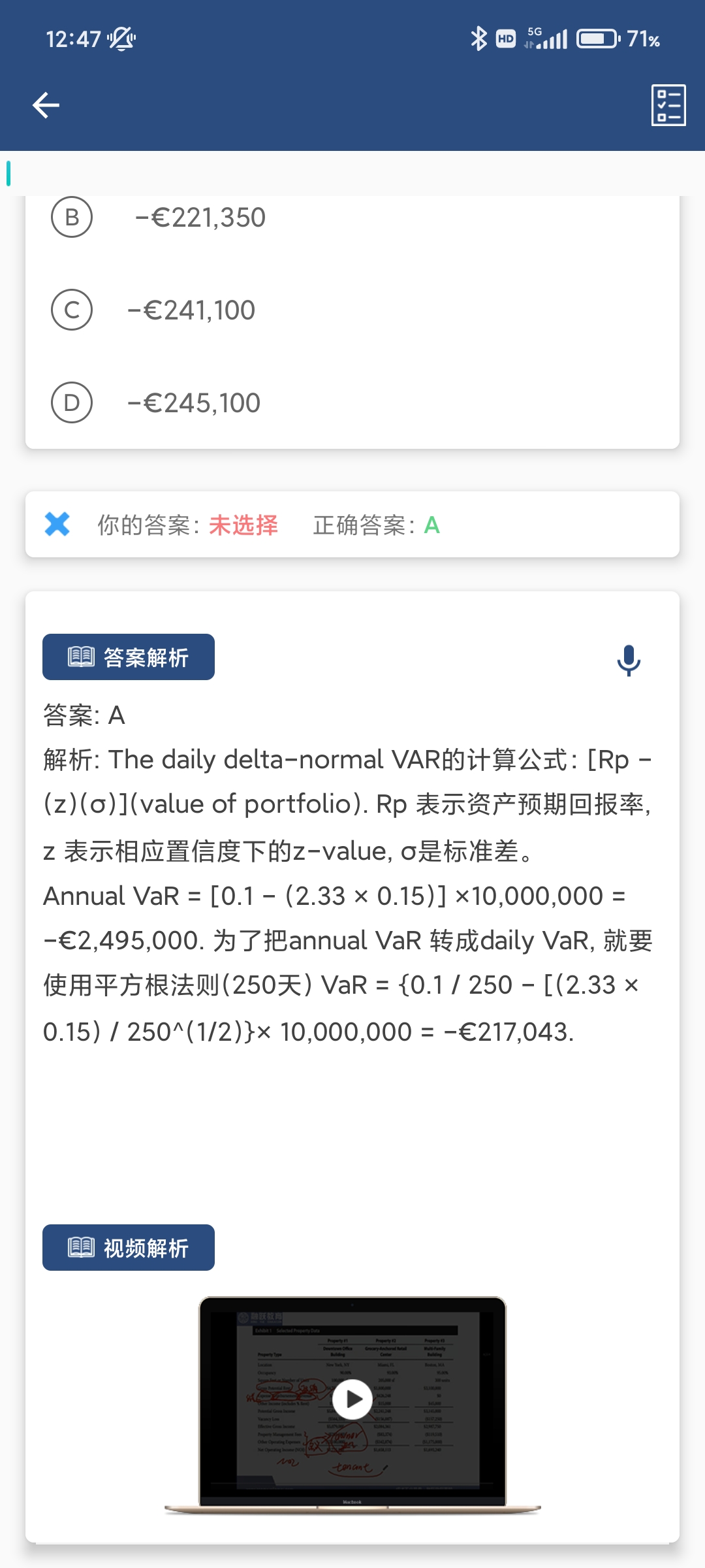 平方根法则的使用前提是均值为0,如果均值不等于0,不能直接用平方根法则。要先把均值调成daily,直接乘除天数就可以调整,然后再把标准差调成daily,这里的调整是要乘除根号下的天数,最后再去算VaR