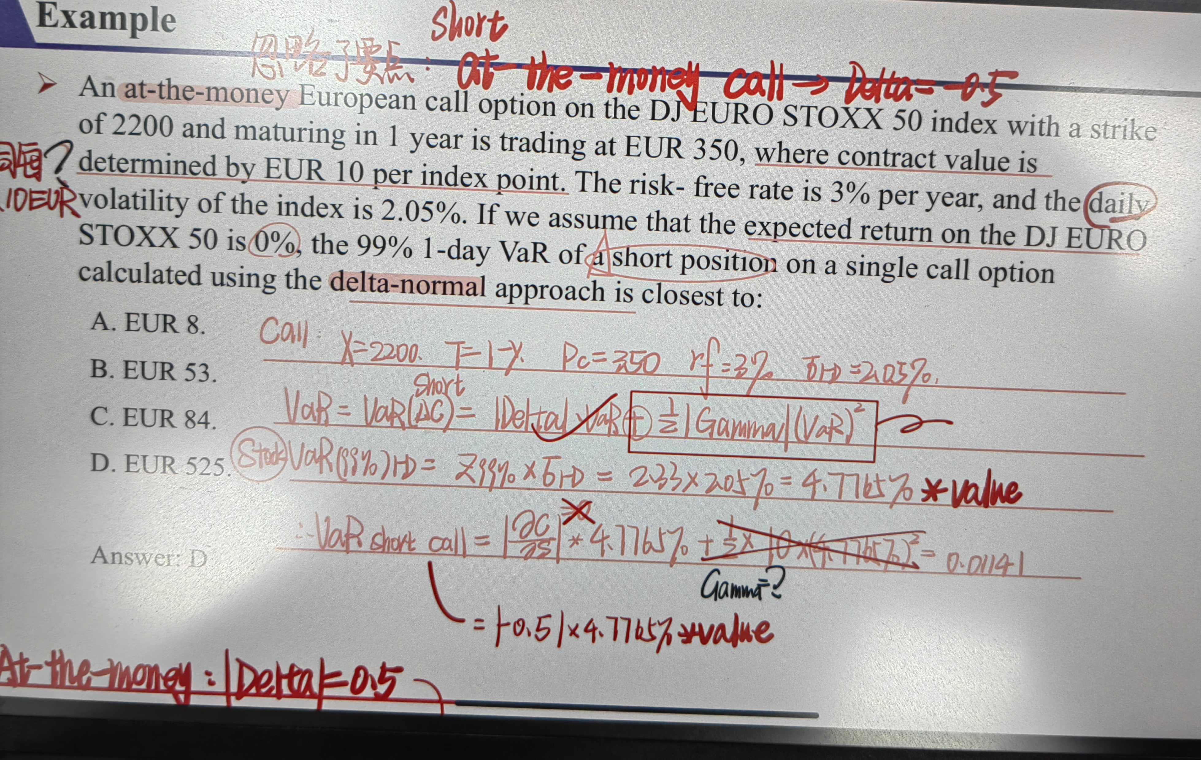 标的资产是指数,delta描述的是标的资产价值变动对期权价值的影响,所以你首先需要有标的资产的价值。指数是以指数点报价的,现在的指数是2200点,但是我们需要的是标的资产的价值,也就是需要指数的价值,不是指数点。所以,题目给出了一个指数点是10EUR,那么2200点就是2200*10 EUR。有了标的的价值,有了标的的波动率,有了置信水平,就能求标的资产的VaR,求出来以后,就能放到delta normal里面,去计算期权的VaR。
