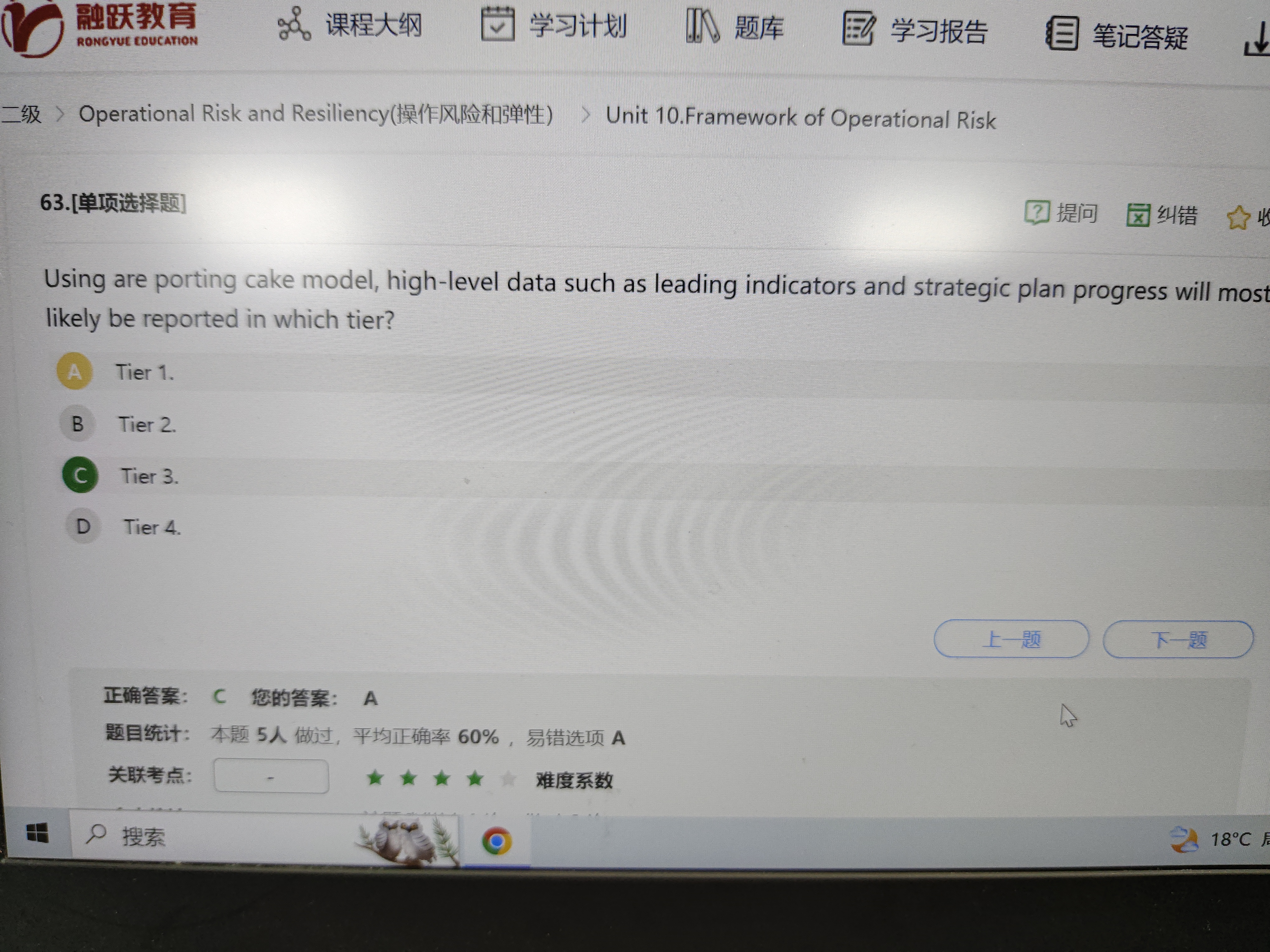 同学你好,这道题的内容是今年新增的知识点,即porting cake model ,蛋糕报告模型,大致意思就是信息的传递顺序,Tier 1代表最前沿的风险检测信息(比如这道题里面的领先型指标和战略计划进展信息都是属于一线信息),Tier 2代表行为执行信息,Tier 3代表决策信息。