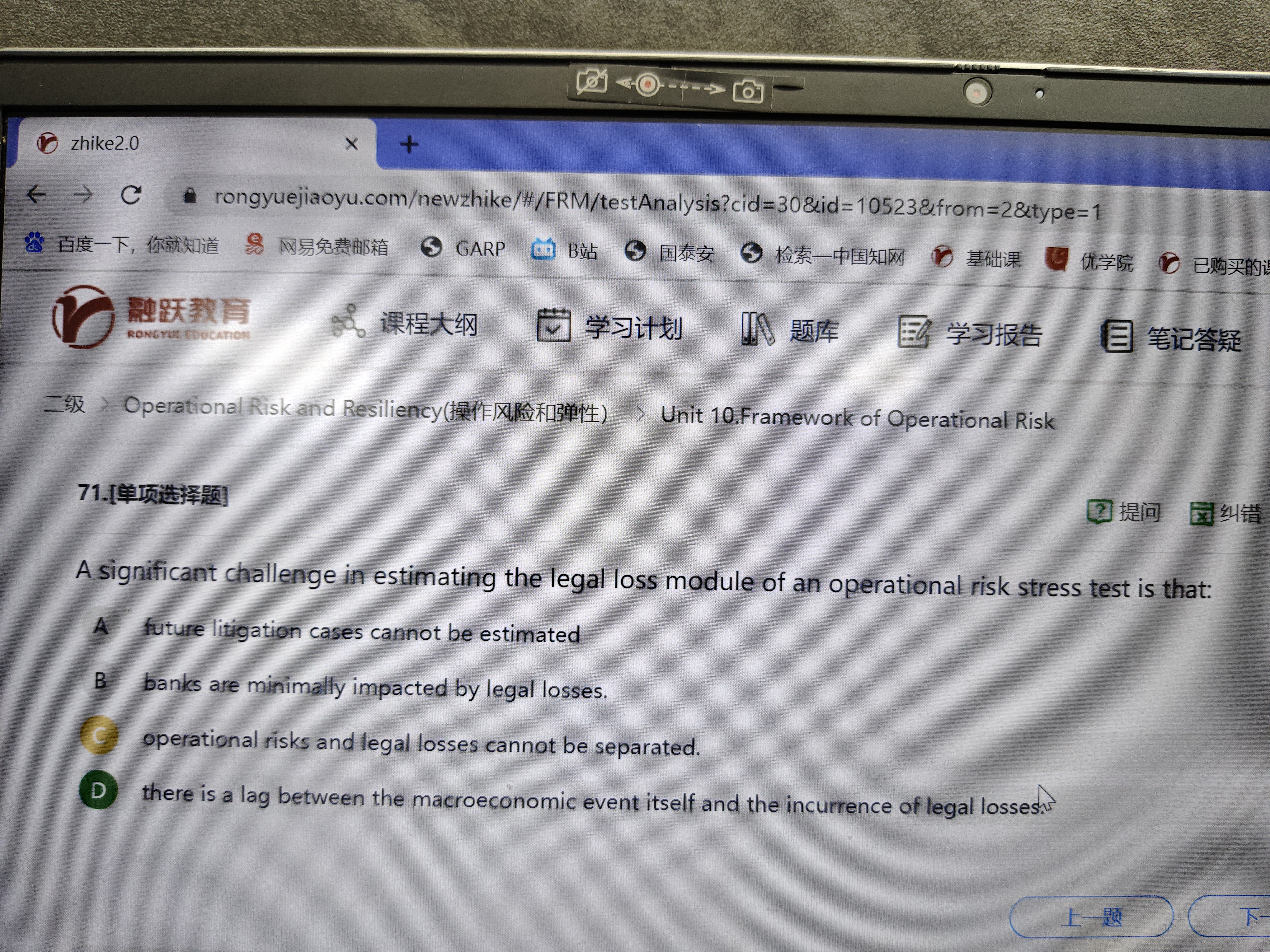 同学你好,C选项的意思是说其他操作风险风险可以跟法律风险所带来的损失可以分开管理,因为法律风险的损失都是可以估计的(有法和案例可以参考,即A选项所述),而且从宏观事件产生到最终因为法律风险所带来的诉讼损失中间有很长的事件间隔(即D选项所说的滞后性),所以两者可以分开管理,因此C选项说法错误。