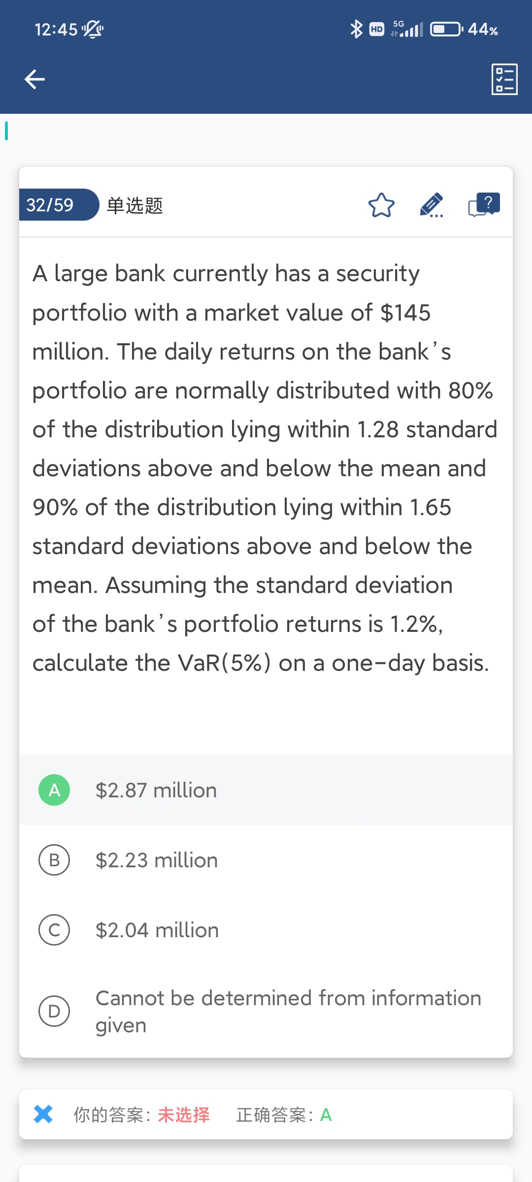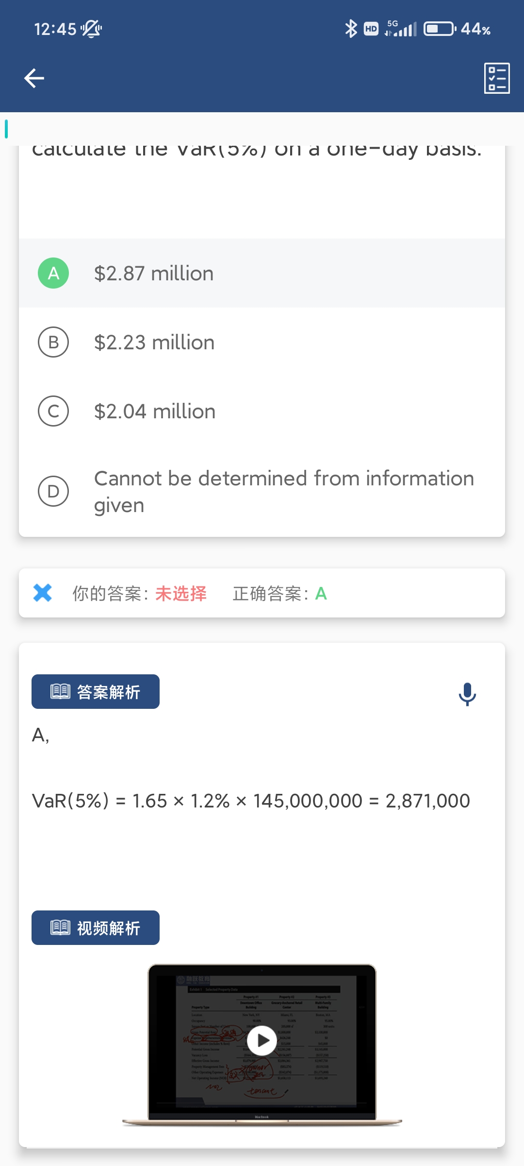抱歉,上一个回复有误,在此修正一下。题目求得是95%的VaR,用的关键值就是1.65(或1.645),1.96是双尾95%的关键值,对应的应该是97.5%的单尾情况