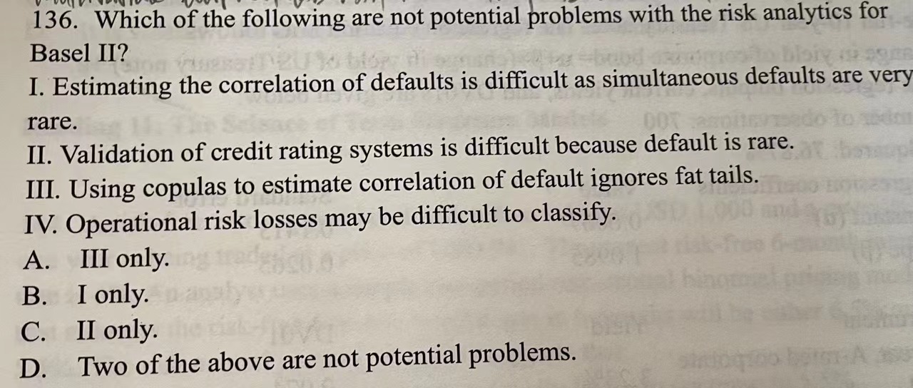 首先,basel2的考点,建议参考考纲来,课程中应该是提到了考纲的要求的,在操作风险当中。其次,危急时刻,收益率分布的尾部会更肥。关于copula的问题,他是考虑到非为情况的,但是在危机的时候,相关系数会上升,尾部会出现急剧变化,这个copula是没考虑到的