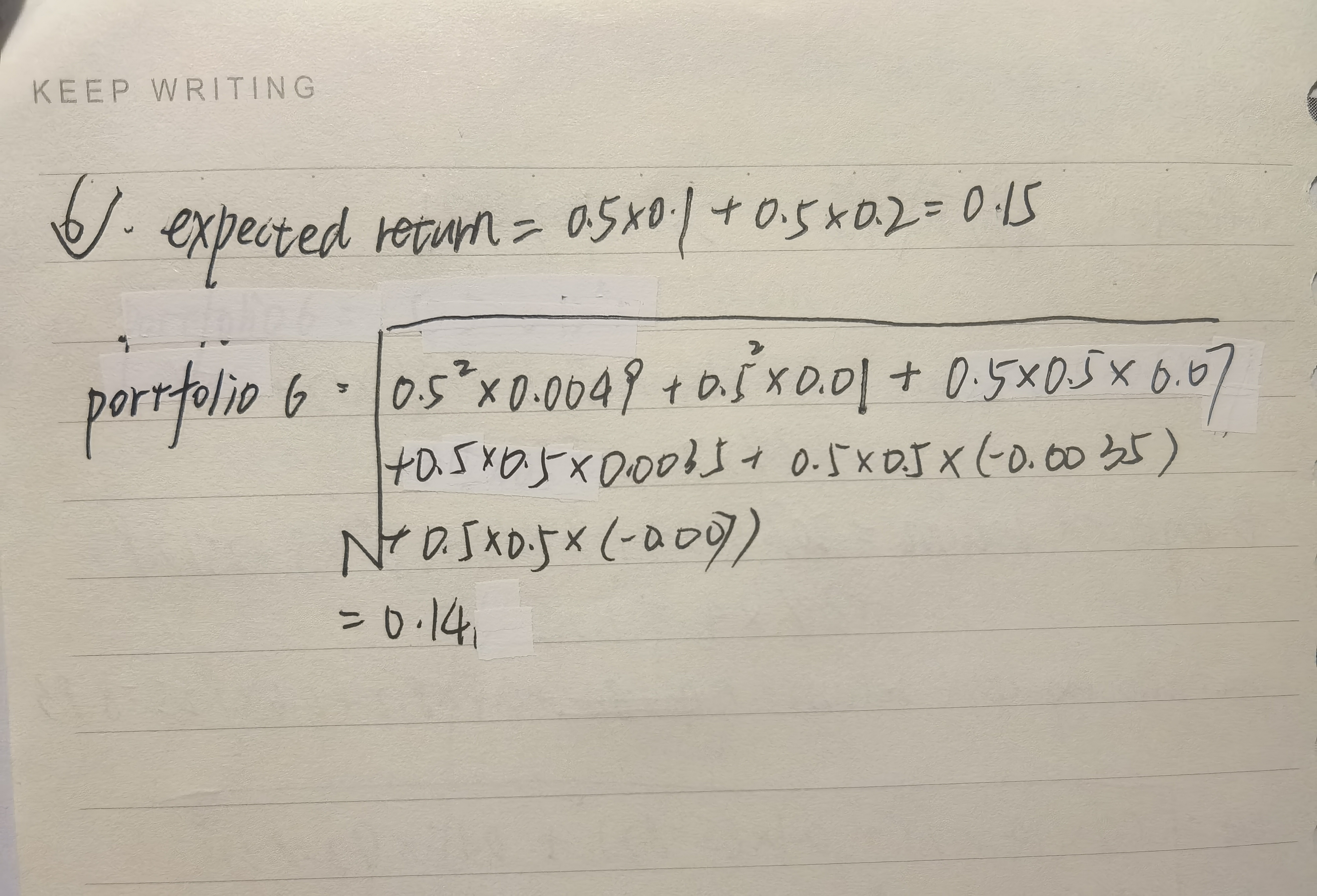 同学你好,你计算组合标准差的时候根号下第三项没有乘以2。