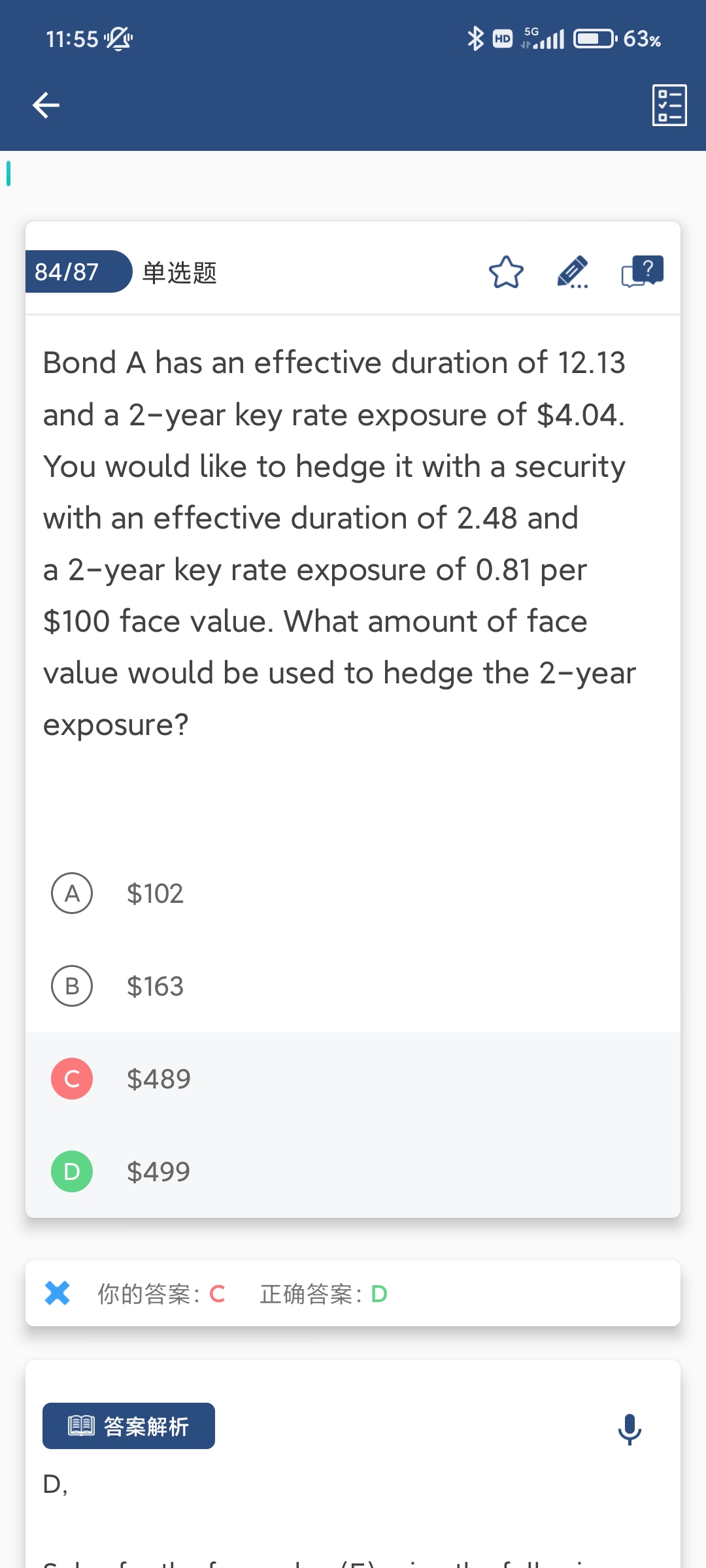 同学你好,关键利率敞口key rate exposure意味着利率是非平行移动,需要用关键利率久期去对冲,具体位置参考图片