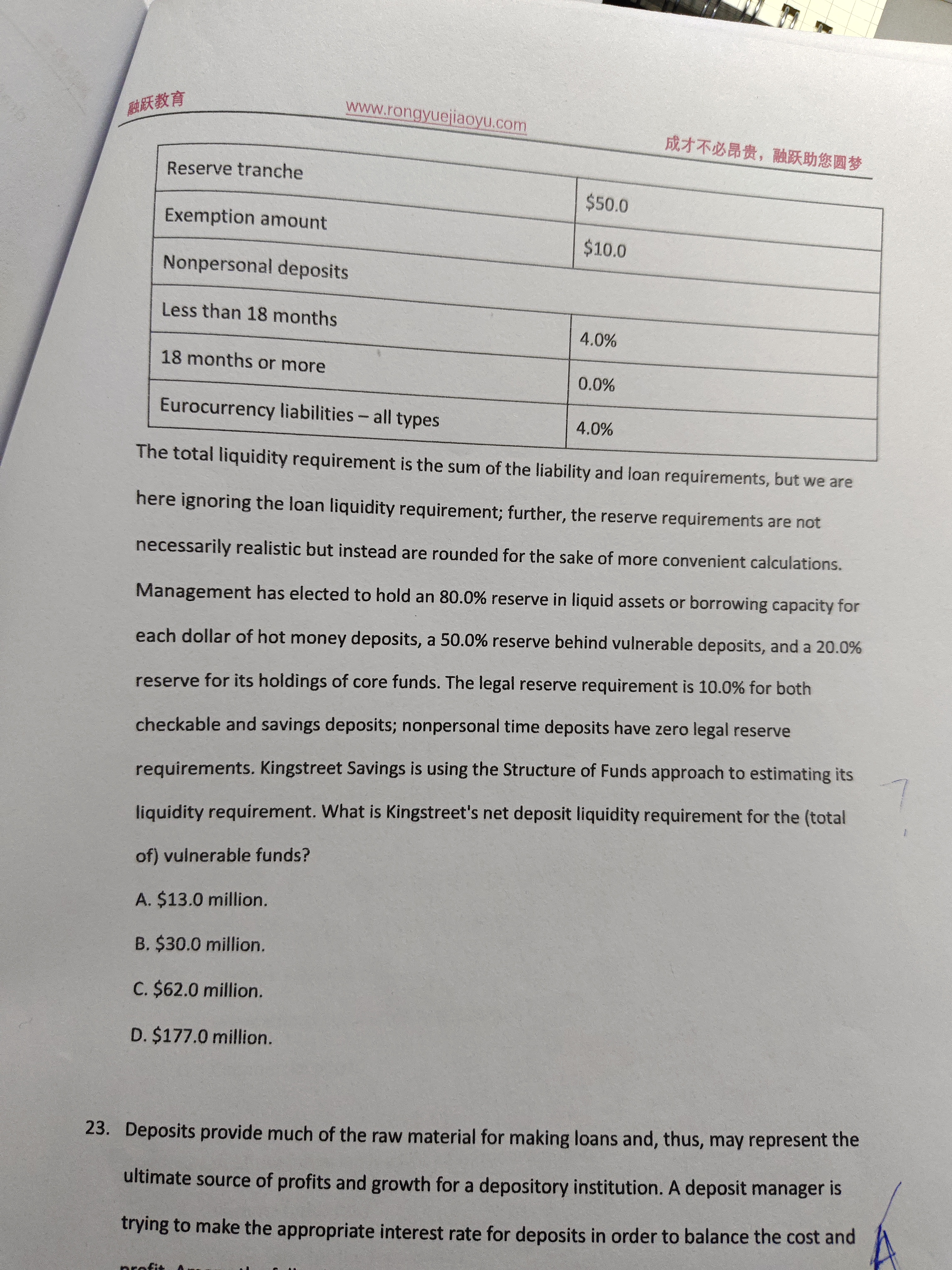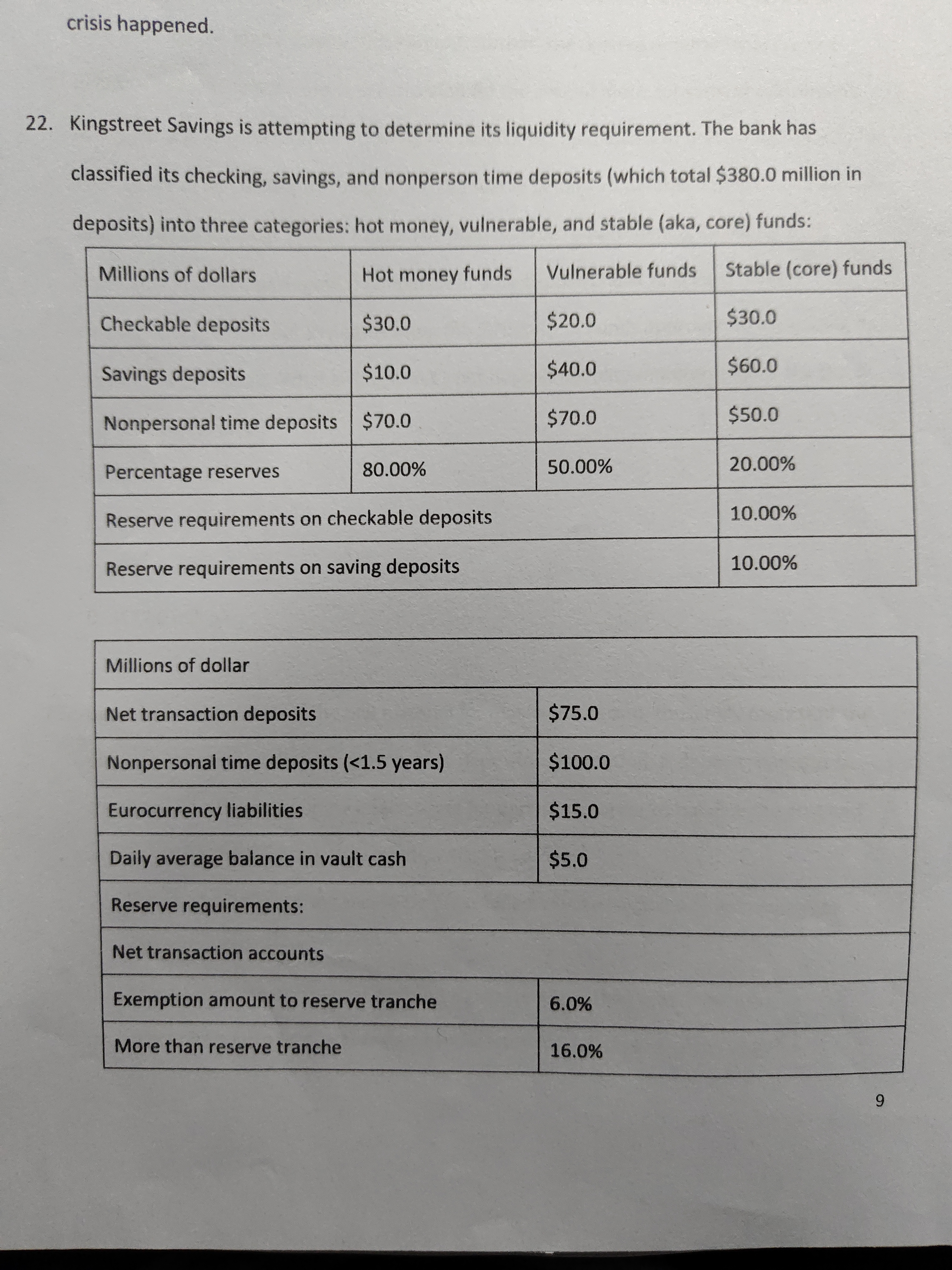同学你好,这道题先看问题,问的是对于脆弱型资金净的流动性要求是多少,也就是只看第一个表格第三列数据就可以了,脆弱型资金的种类有三种,先分别计算这三种类型的资金各自的当前余额(就是第三列前三个数字)减去对应的法定准备金头寸(最后一段文字从第6行末开始的描述)比例分别是10%、10%、0%,得出脆弱型资金在扣掉法定准备金后总的流动性金额,然后再把这个金额乘以脆弱型资金的流动性要求比例50%(最后一段文字第四行末)就是最后要计算的结果。