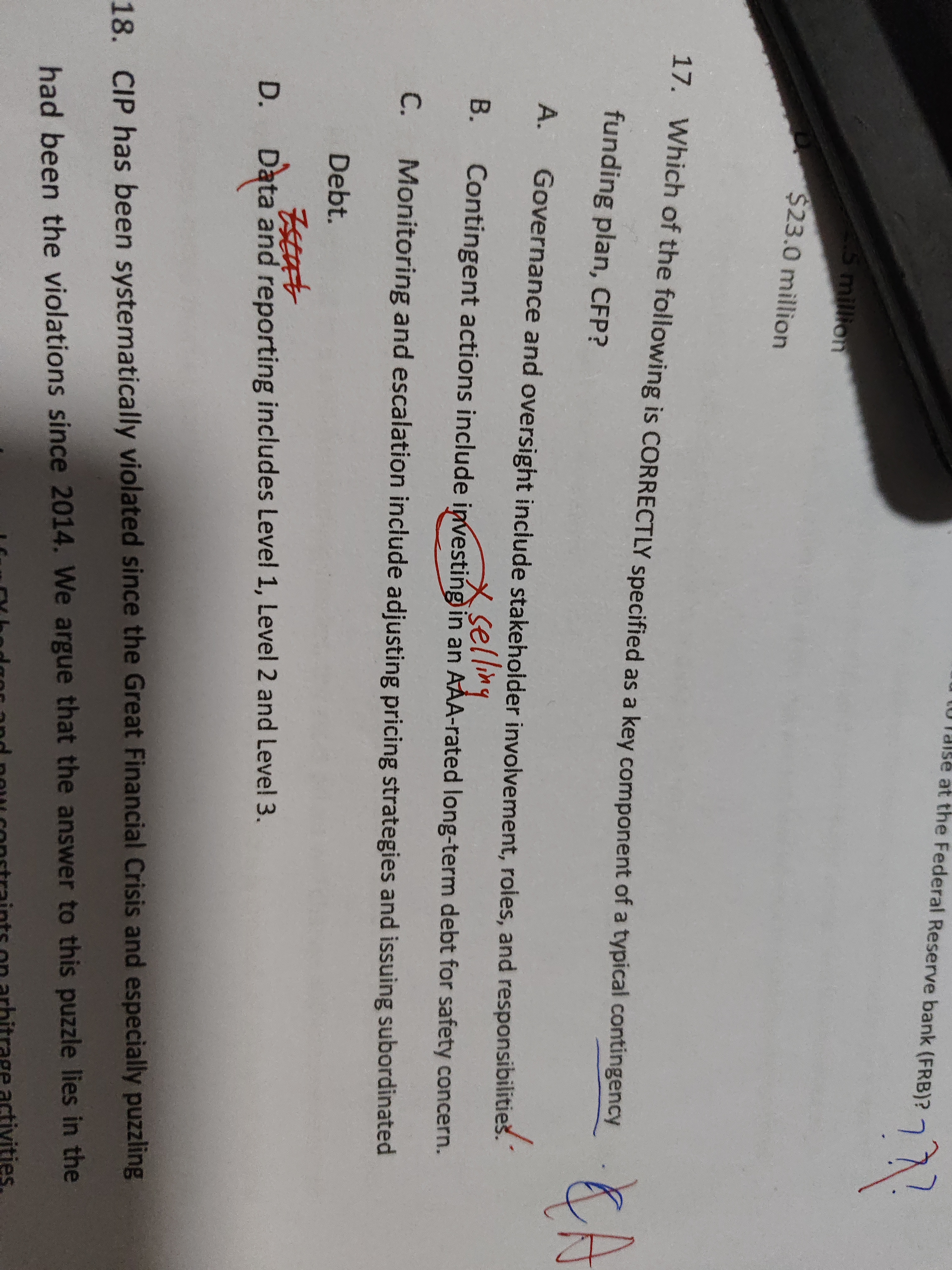 同学你好,B选项中所说的应急行动当中没有包括投资AAA级债券,应急计划应该是出售高流动性资产,比如AAA债,所以错误;C选项所说的monitoring and escalation的内容没有涉及定价策略的调整和使用次级债,所以错误;D选项所说的包括Level 1、2、3是选项C中monitoring and escalation的内容,所以D错误。