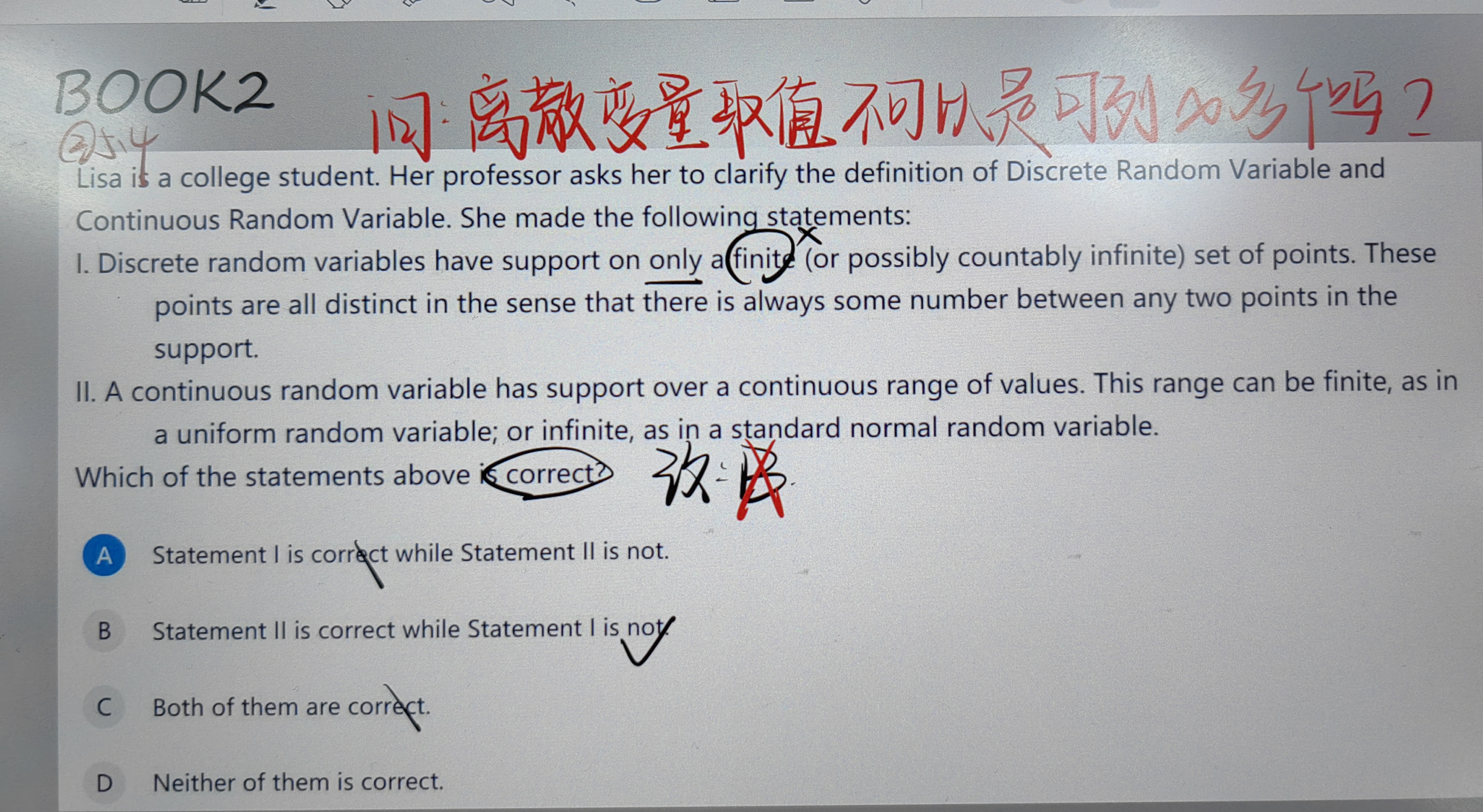 同学你好,离散变量必须是可数的,这里的可数有两层含义:1.取值是有限的;2.是可列的(即可以是无穷多个,但是是可列的)。