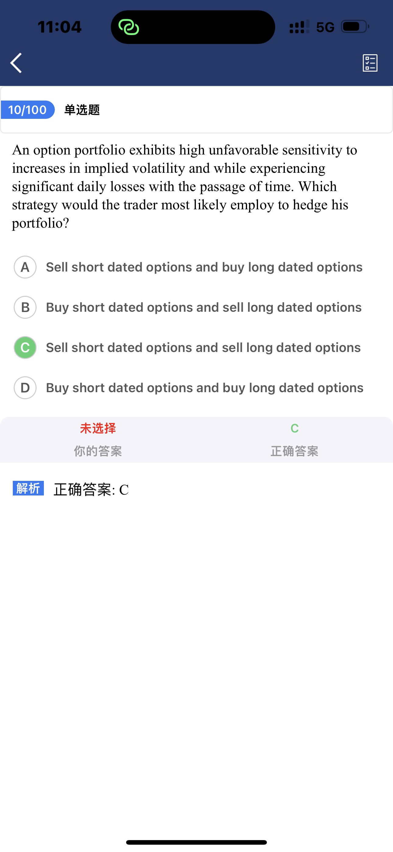 题目说对波动率上升,有很高且不好的敏感度,意味着Vega是一个很大的负数,且随着时间的流逝,会有很大损失的出现,也就是theta也是一个很大负数。现在要引入一个大的正Vega和正theta。期限越长,Vega越大,且Vega在ATM的时候实现最大值。所以是long long-term option。theta也是在ATM实现最大值,且距离到期越近,theta从数值上越大,所以short short-term option。这题最终答案应该选A,机考给的答案是有问题的