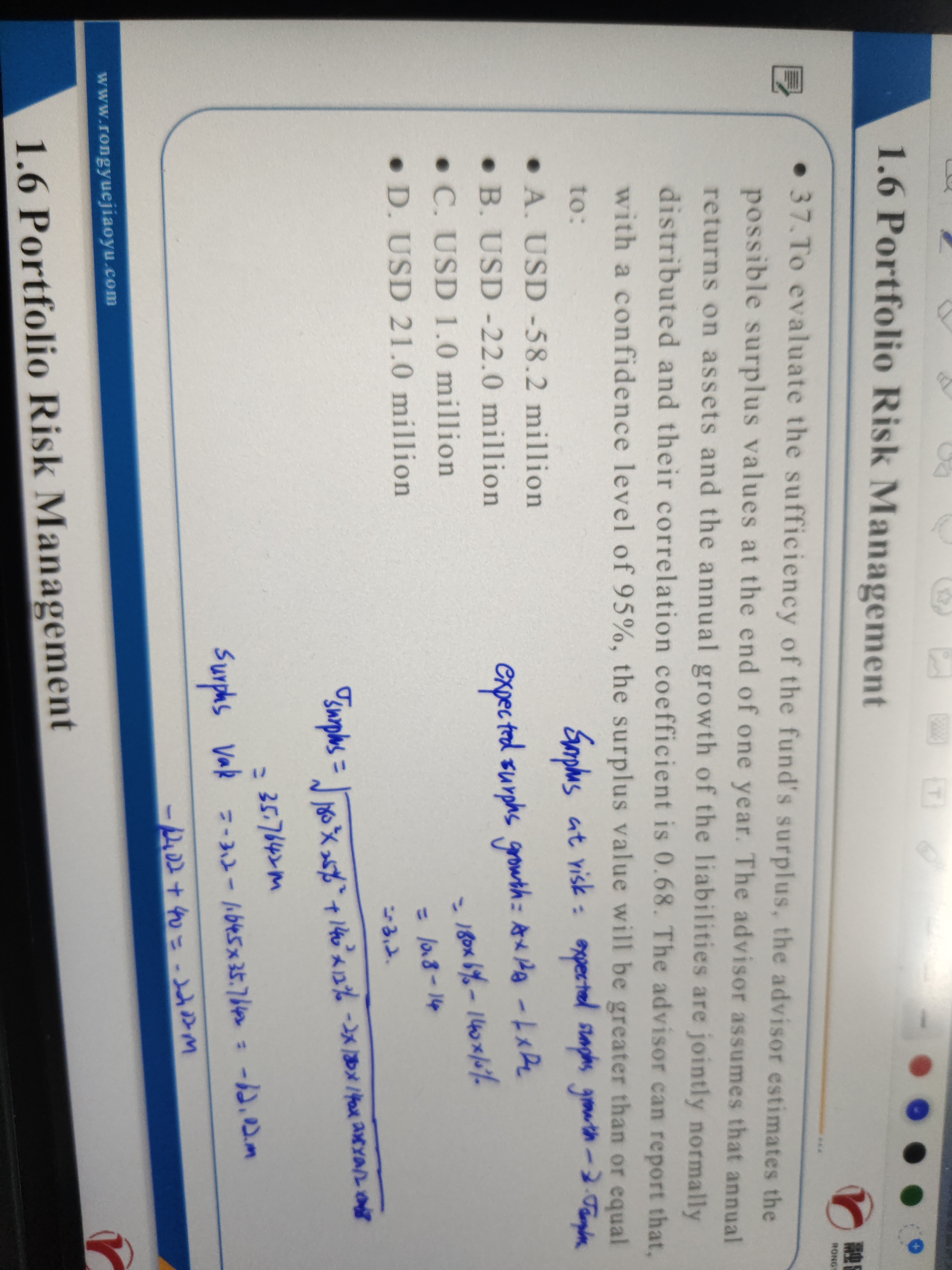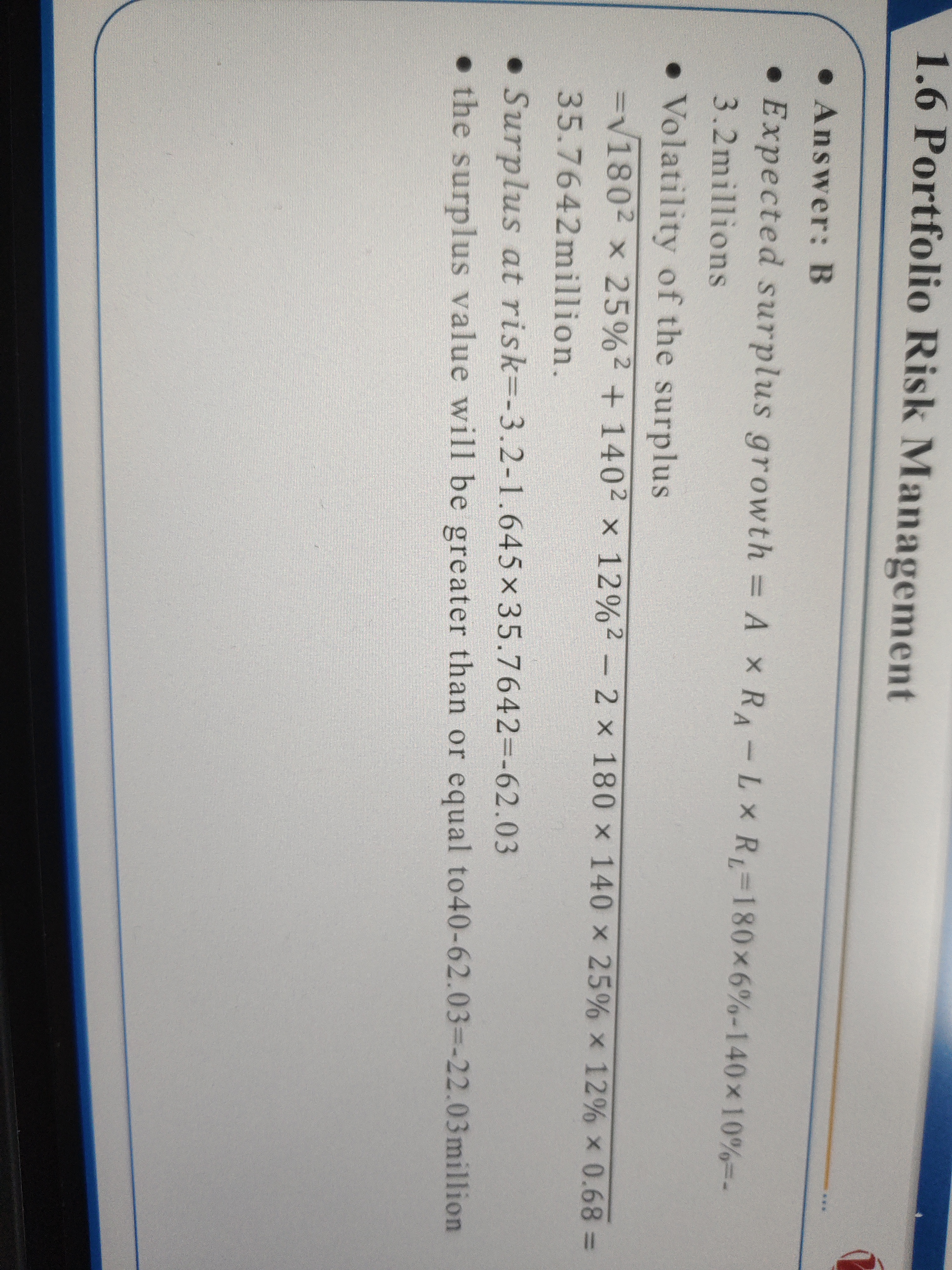 同学你好,我们一般在计算组合的波动率的时候,组合的资产都是相加的关系,而surplus指的是资产减负债,是相减的关系,所以前者是加上2×相关性系数×其他数,而后者是减去2×相关性系数×其他数。