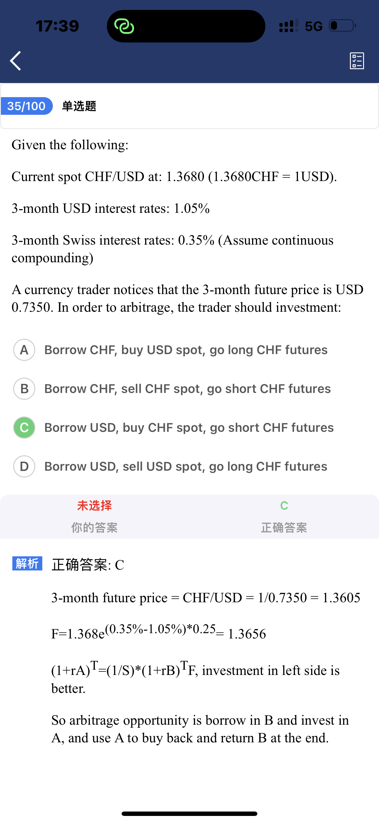 我算出来的是远期价格较低,现价价格较高,应该买远期卖现货,怎么答案没有