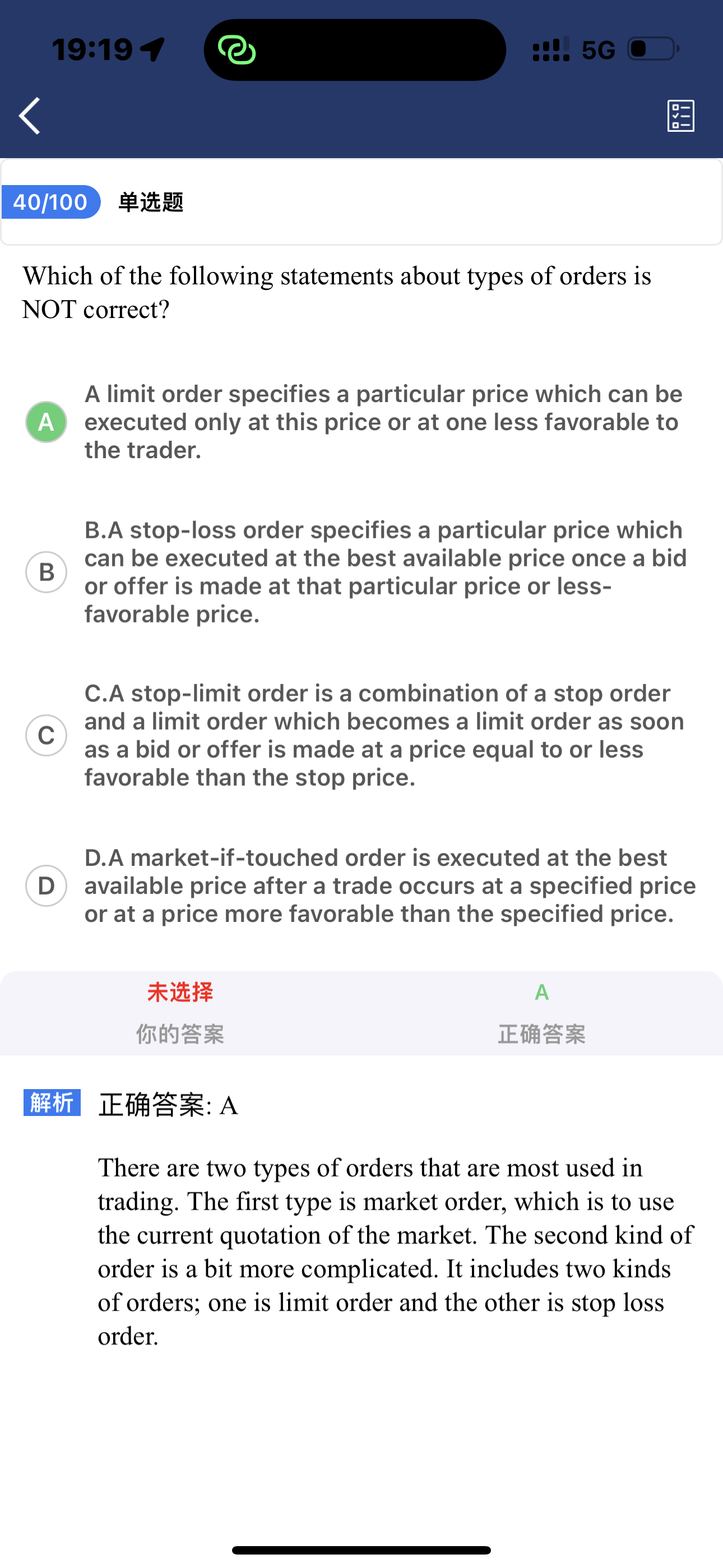A选项的描述的less favorable是错的,limit order是在触发特定价格的瞬间完成交易,这个应该是对投资着更有利的,因为这个价格的限定是投资者设置的心里愿意接受的价格