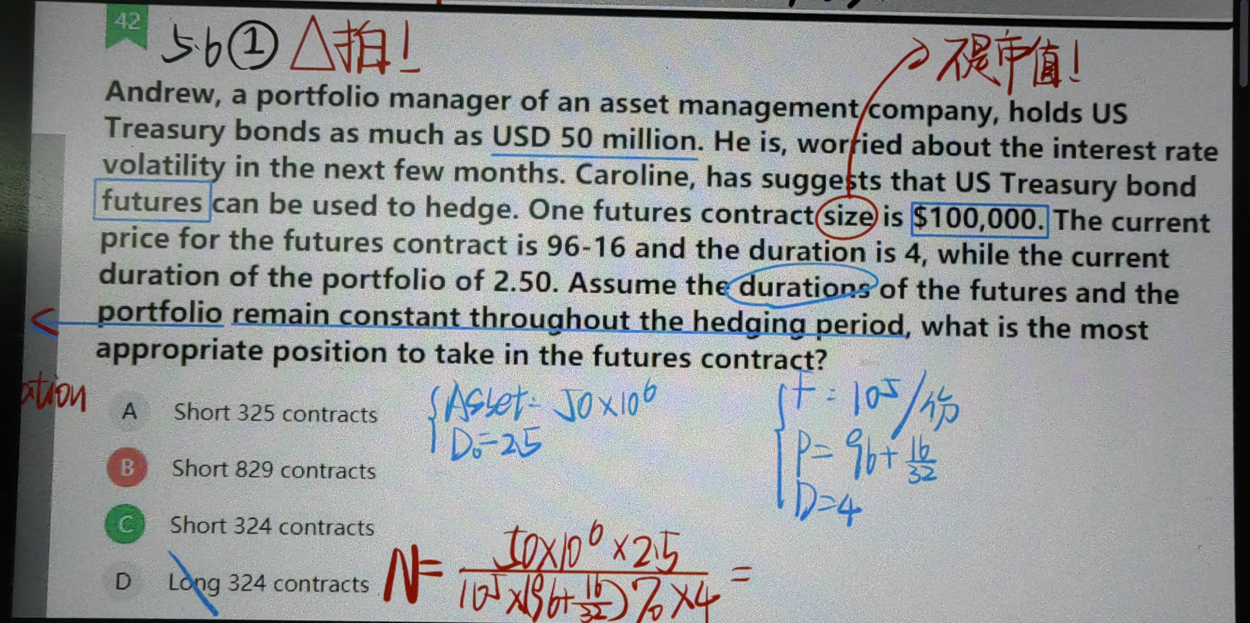 contract size是面值没错。讲个小技巧,如果题目里面对于一个相同的资产,有一个很大的数值,有一个很小的数值,往往大的数值代表的就是面值,小的数值代表的是价格。比如有的题目可能说,我有50mil的债券,债券的价格当前是98,也就是说,债券的总面值是50mil,我现在手里一共有(50mil/100)份债券,这些债券现在值多少钱呢,就用价格乘你持有的债券数量。这里同理,债券部分只给你50mil,没有别的信息了,所以你只能默认价值=价格。但是对冲工具,合约的size是固定的,还有个价格给你,所以你能算总的价格。这个技巧你感受下,能不能更好的帮你理解这类的考题,不要只关注一种表述方法,这种表述方法可能会在很多地方出现