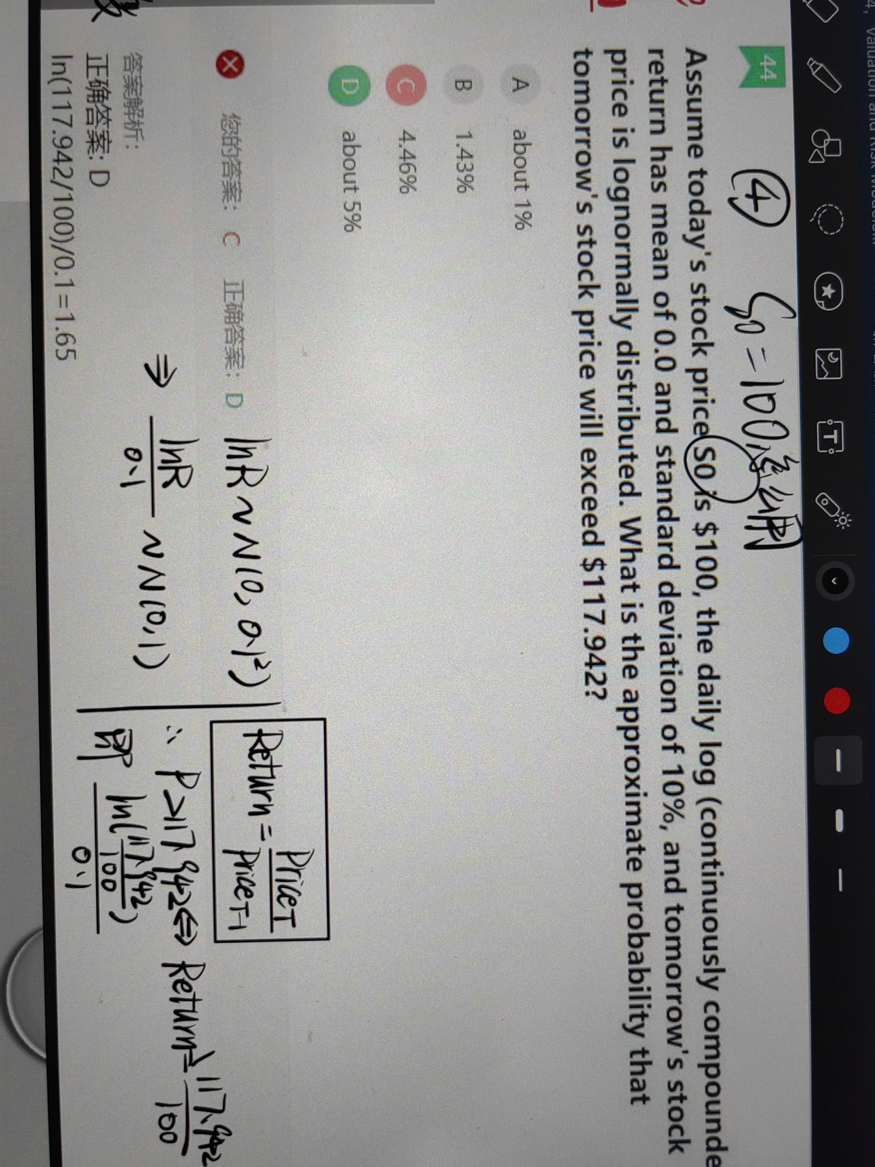 FRM里面两种收益率的计算方式,一种就是持有期收益率,用期末价格减起初价格加期间现金流收益,除起初价格。另一种就是对数收益率,用期末价格除期初价格,然后取对数。FRM喜欢对数收益率,但是有时候我在分析问题的时候,为了让大家更直观感受到结论的来源,我会用持有期收益率,比如在SML当中,分析高估和低估,买入和卖出的决策问题,这种时候用持有期收益率分析更清晰一点,但是在计算层面,建议用对数收益率。实际上,两者偏差不会很大,对数收益率的原理就是取对数,比如,起初价格*(1+r)=期末价格,所以1+r=期末价格/起初价格,两边取对数,ln(1+r)=ln(期末价格/起初价格),左边处理一下,ln(1+r)约等于ln r,所以有了这样的表达。至于为什么要用对数收益率,主要是对数收益率在运算的时候有经济学意义,但是持有期收益率的运算不具有经济学意义
