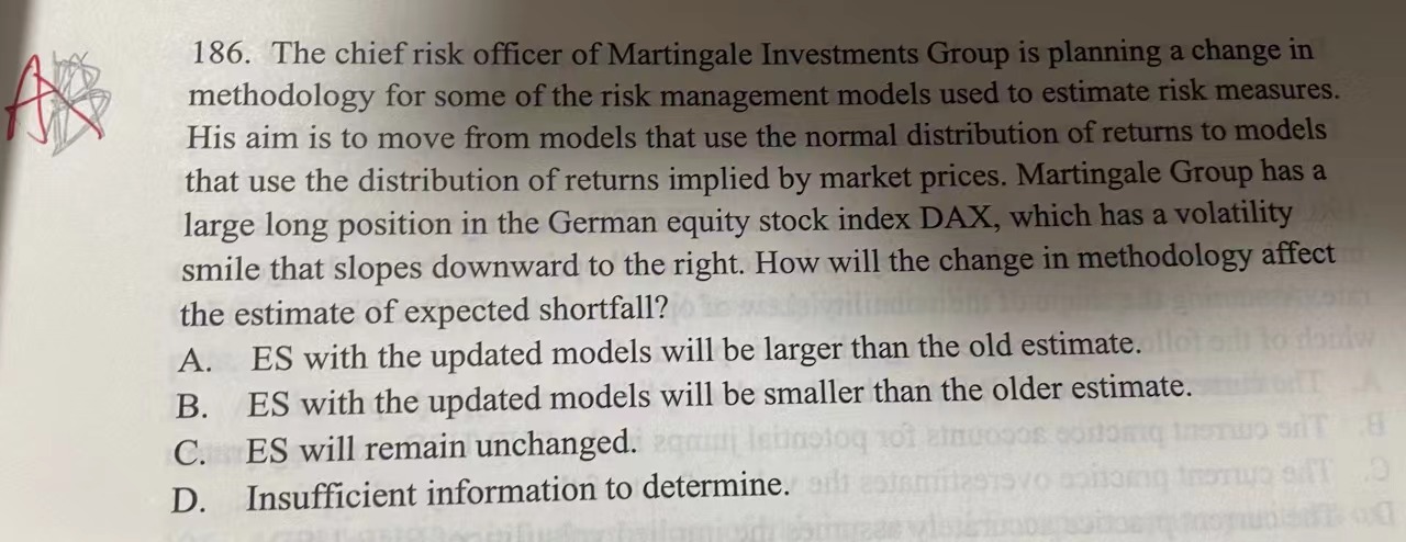 ES是超出VaR的损失的均值,因为本身就描述的是损失,所以是不带负号的。现在他告诉我们,波动率微笑更倾向于右下,并且是股票期权,那么很明显,相比于股票期权的波动率微笑,实际情况应该左尾更肥,右尾更瘦,既然左尾更肥,更新以后的损失的均值自然就会更大