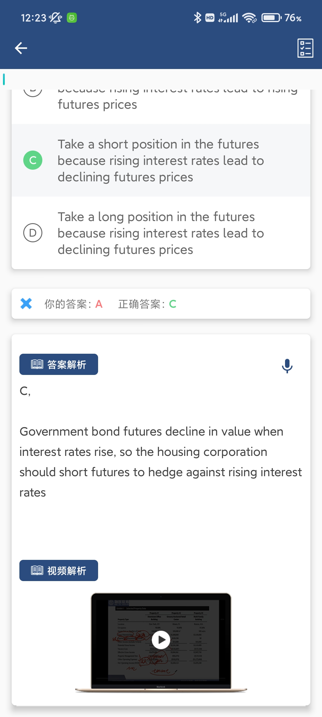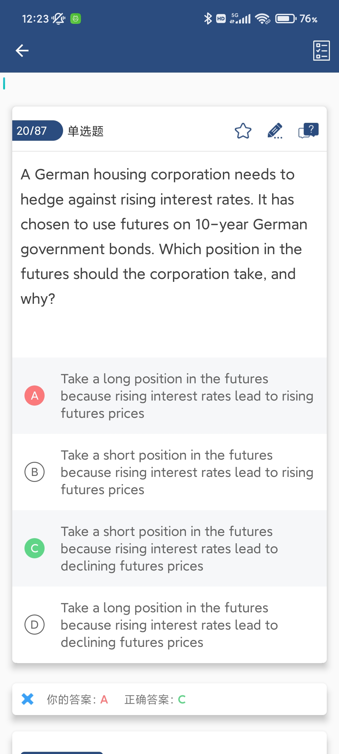 同学你好,题干的背景是我要对冲利率上涨所带来的风险,如何对冲呢,就是我通过衍生品交易在利率上涨的时候获利来实现对冲,而当利率上升时,10-year German government bonds的标的资产bond价格下跌,对应的bond期货价格也下跌,所以我只要提前做空,就可以从bond期货价格下跌中获利。