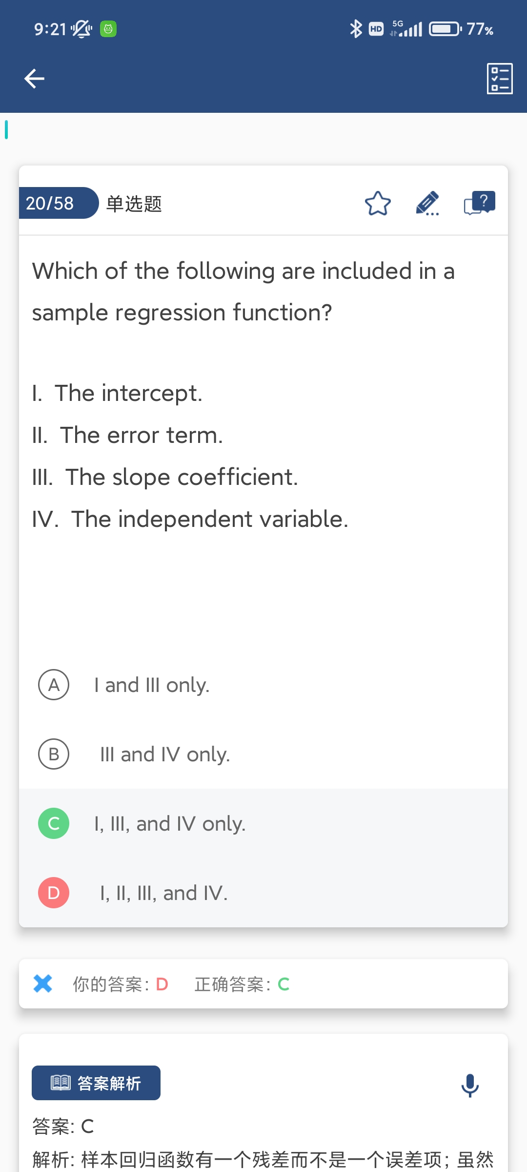 同学你好,残差项和误差项比较相似,但也有细微的差别(考试不考,理解即可) 一、性质不同 1、随机误差项:不包含在模型中的解释变量和其他一些随机因素对被解释变量的总影响项。 2、残差:残差在数理统计中是指实际观察值与估计值(拟合值)之间的差。 二、作用不同 1、随机误差项:各种随机因素对模型的影响,反映了未纳入模型中的其他各种因素的影响。 2、残差:“残差”蕴含了有关模型基本假设的重要信息。如果回归模型正确的话,可以将残差看作误差的观测值。