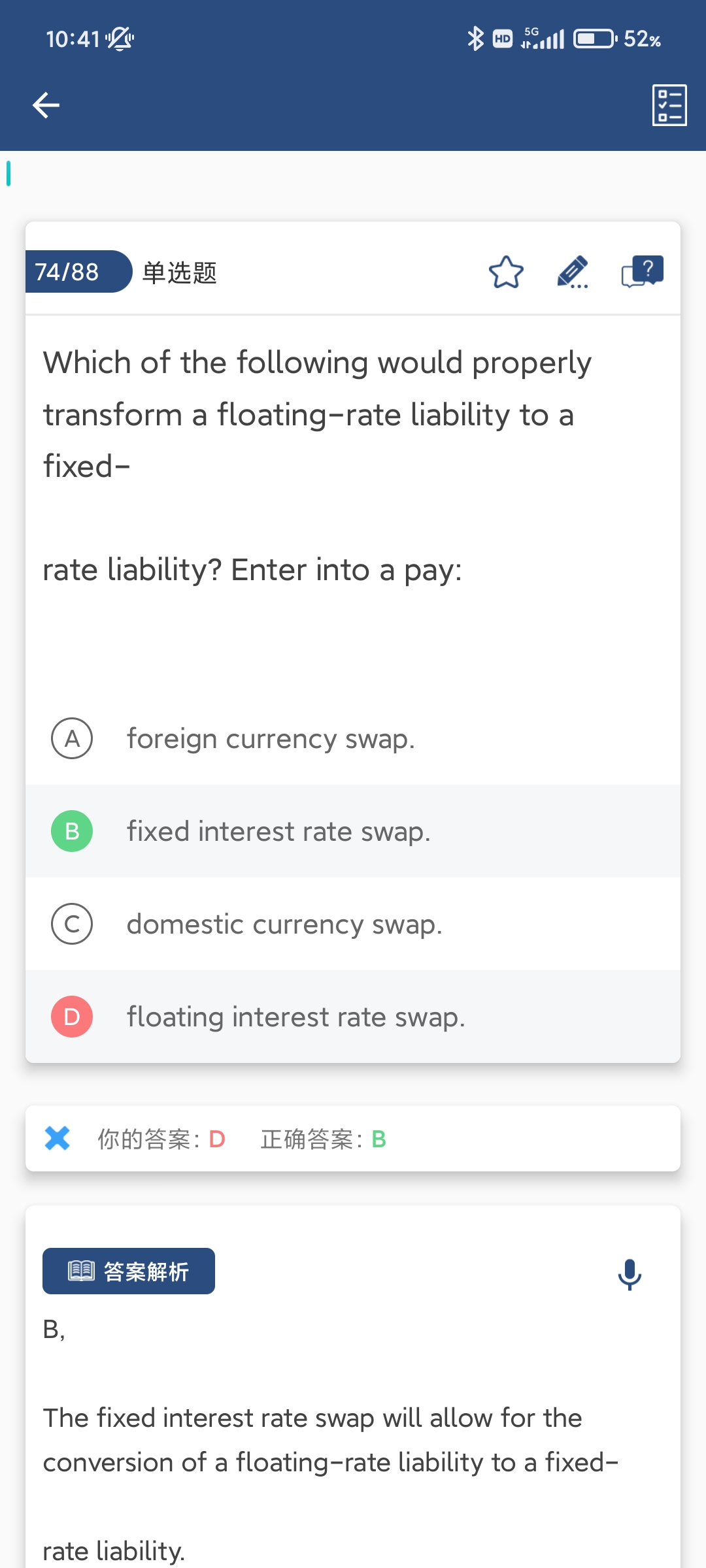 同学你好,题干想要把浮动利率债务转化成固定利率债务,而债务都是要在未来支付现金流的,所以要进入一个支付固定利率的互换合约。