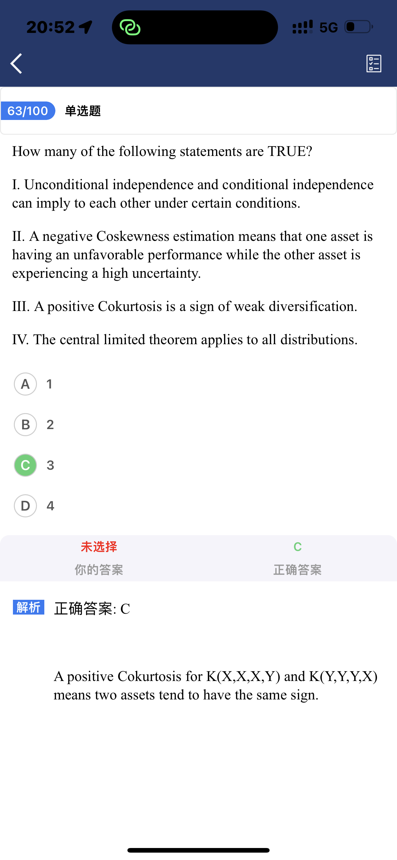 同学你好,第一个说法:条件独立和无条件独立是不能相互推导的,不同条件下的条件独立互相不影响,无独立是条件为空的条件独立,并不保证其他条件下也独立这个是概率论方面的点,记住结论即可;第二个说法:关于负的斜偏度的性质,负的斜偏度意味着负的斜偏度的分子没有平方的那一项是负数,也就是收益小于均值,而分子中带平方的那一项则不确定,这是投资人不喜欢的一种情况,所以这个说法正确;第三个说法:正的斜峰度代表着斜峰度的分子可能同时为正数(不做讨论)同时为负数(此为比较糟糕的情况,是我们讨论的情况,说明没有分散化效果,或者说分散化效果非常差,所以此说法正确;)第四个说法:在大样本下,任何分布都可会趋近于正态分布,所以说中心极限定理适用于所有分布,说法正确。