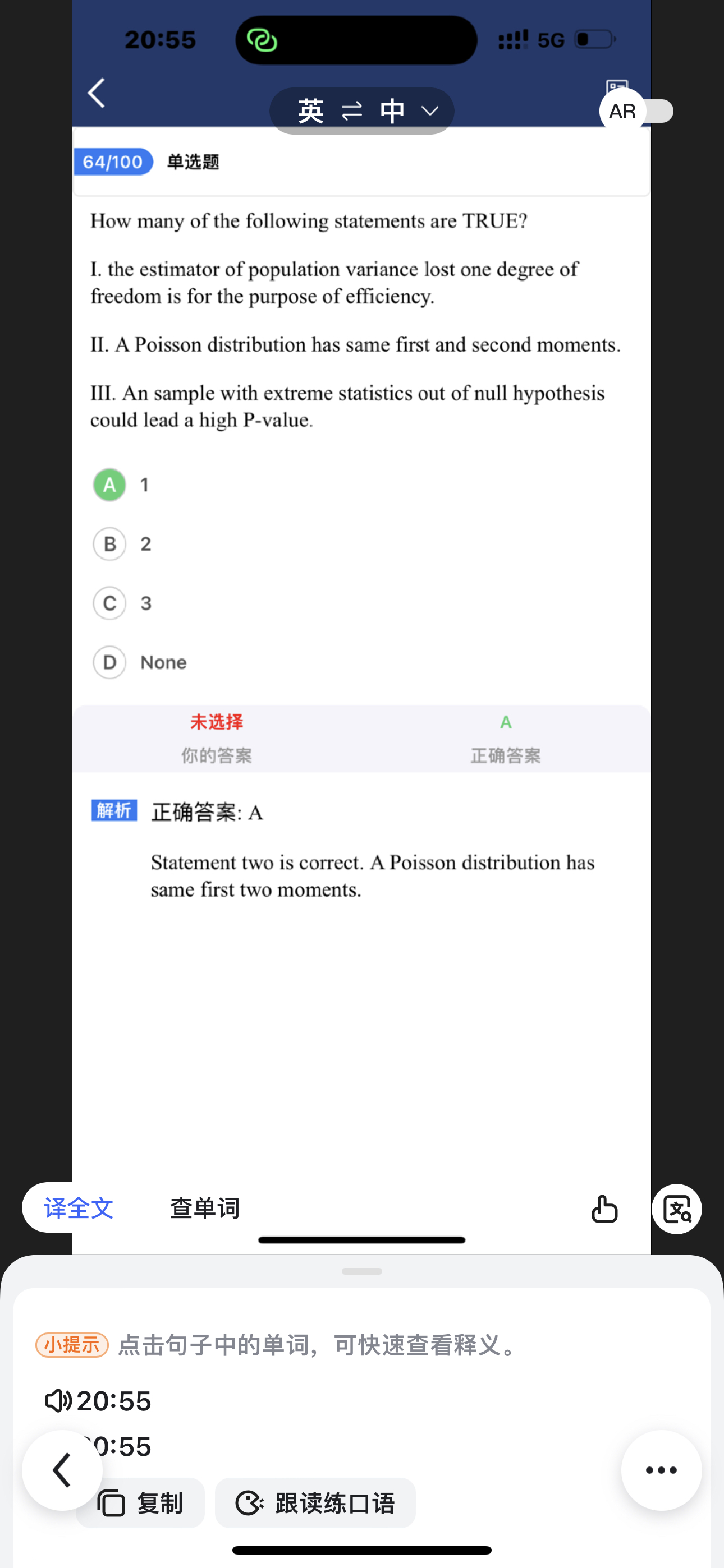 同学你好,第一个说法错在总体方差的估计量少一个自由度的目的是为了保证无偏性而不是有效性;第三个说法错在含有极端值样本的原假设应该是更有可能导致拒绝原假设,也就是有一个小的P值,而不是大的P值。