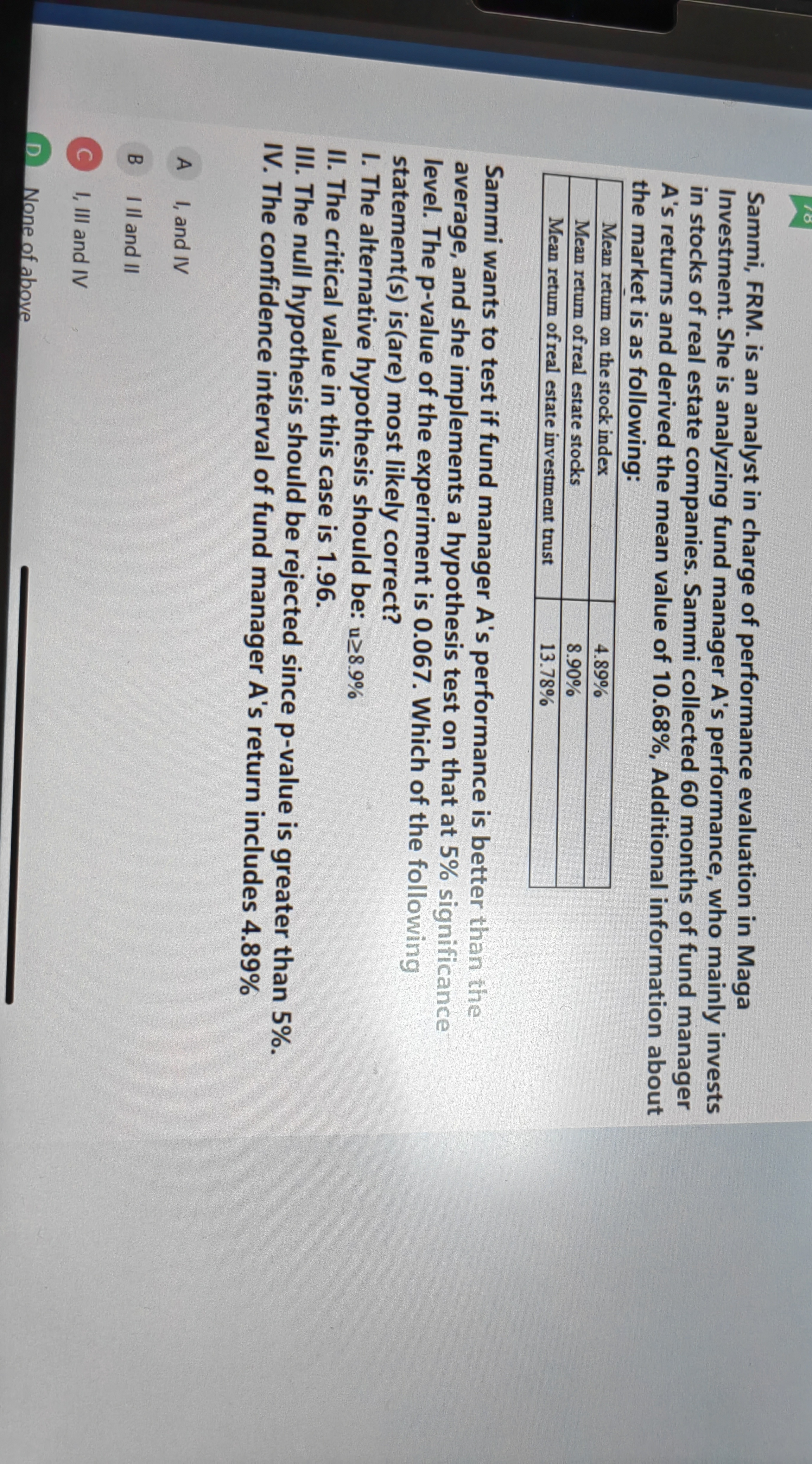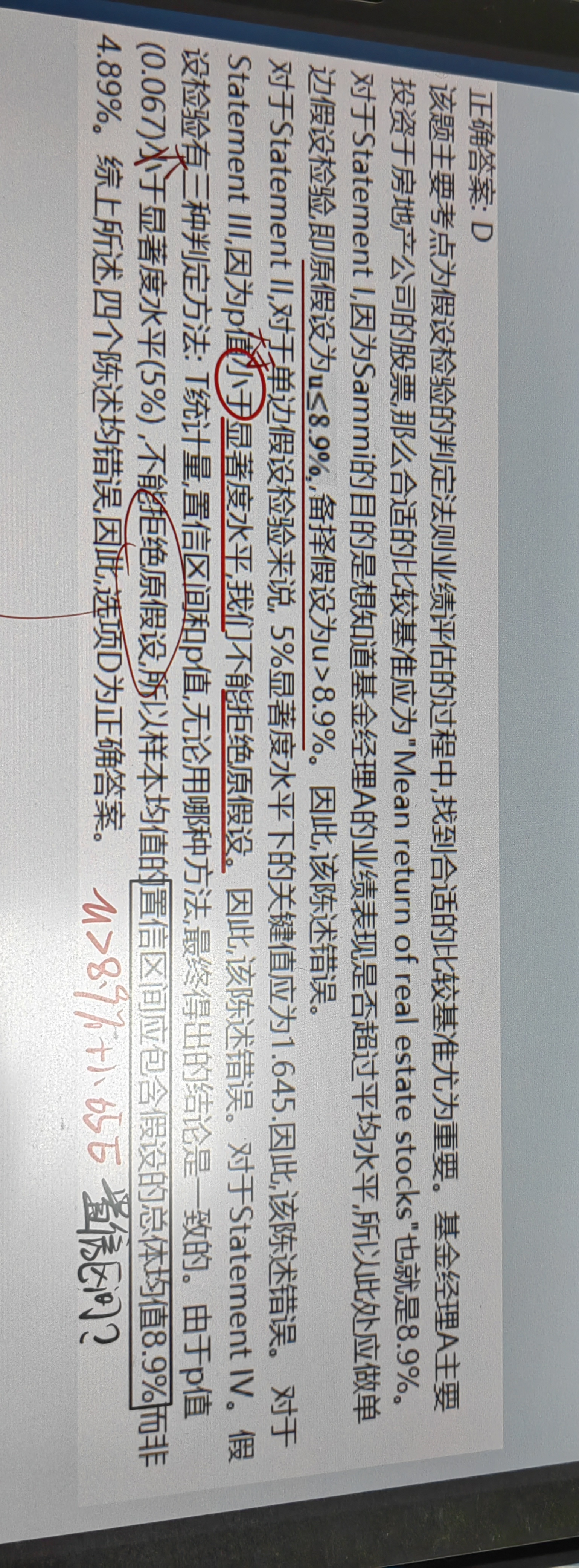 同学你好,解析没问题,说法3中P值0.067大于显著度水平0.05,所以不能拒绝原假设,而说法3说可以拒绝,所以错误,注意题干问的是那个是正确的,答案是一个都不正确,同时由于这道题没有给出标准差数据,所以无法计算出具体的置信区间,但是根据P值大于显著度水平,所以可以确定均值8.9%一定是在置信区间内(结论是无法拒绝原假设,如果8.9%在置信区间外,那么就要拒绝原假设);另外你的表述关于说法1的理解是正确的;