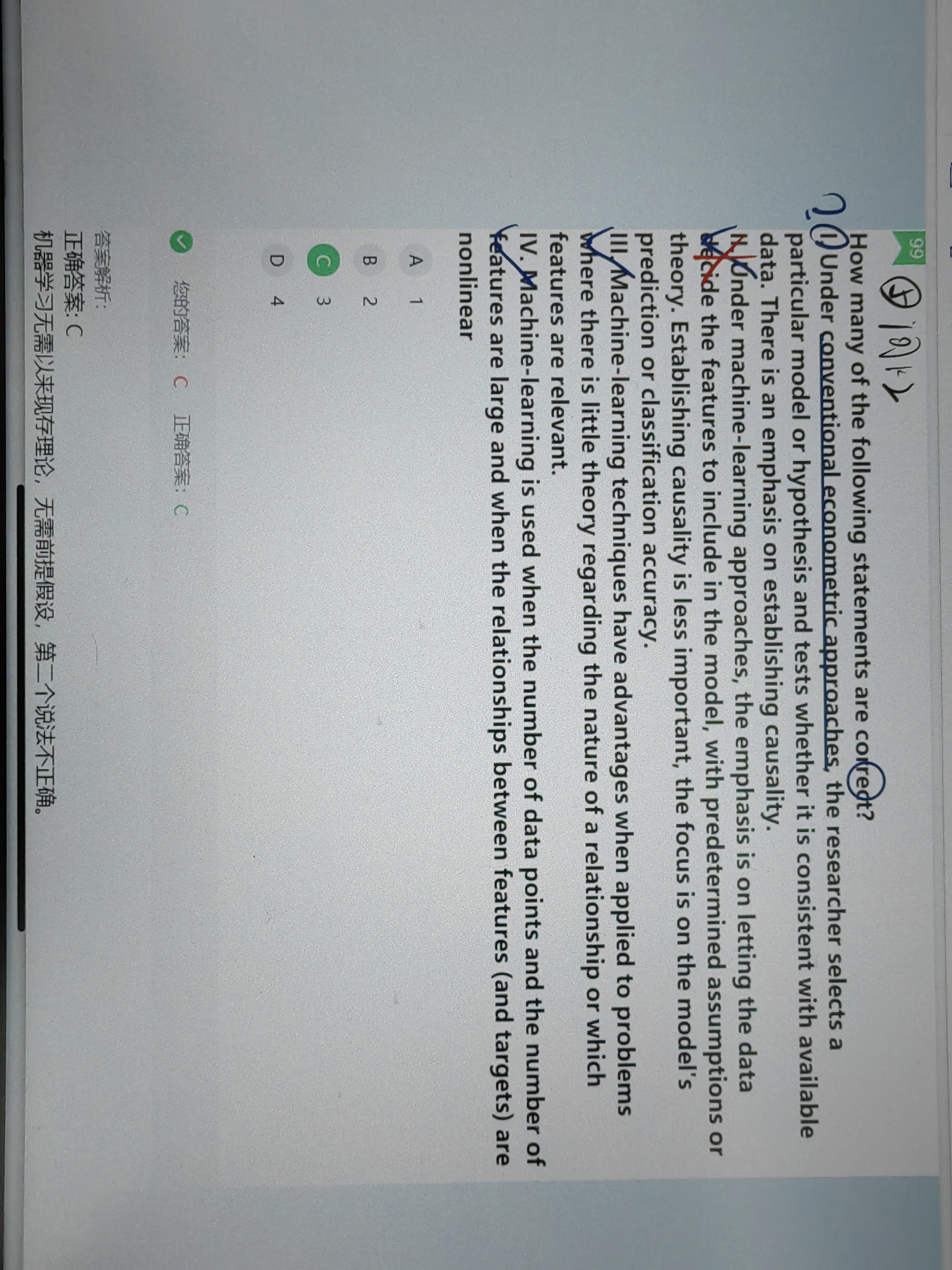 同学你好,第一个说法说的是对于传统的经济方法,都是先基于某种理论假设,然后通过建模去检验这种假设是否正确,其实就是回归中的参数显著性检验;第二个说法前半句中关于基于事先假设这一部分是错误的,后半句是对的。
