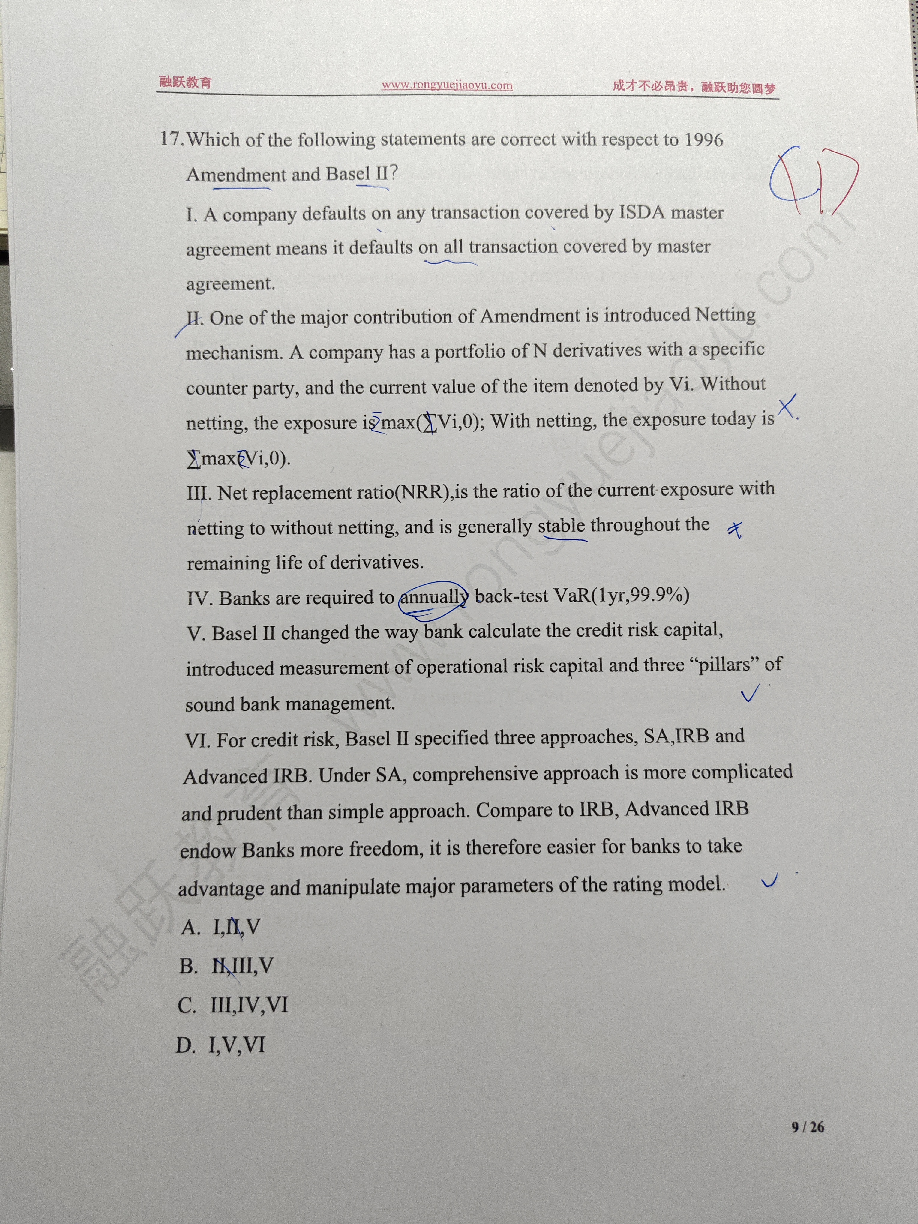 同学你好,第一个说法说的是在ISDA主协议下,如果这个公司违约,与这个公司相关的所有交易都违约,这是一个正确的表述;第三个说法,因为衍生品的敞口会随着衍生品的价格和剩余时间的变化而变化, 所以NRR的计算会发生变化;第四个说法的回测期限正确表述应该是一天的99%的VAR.