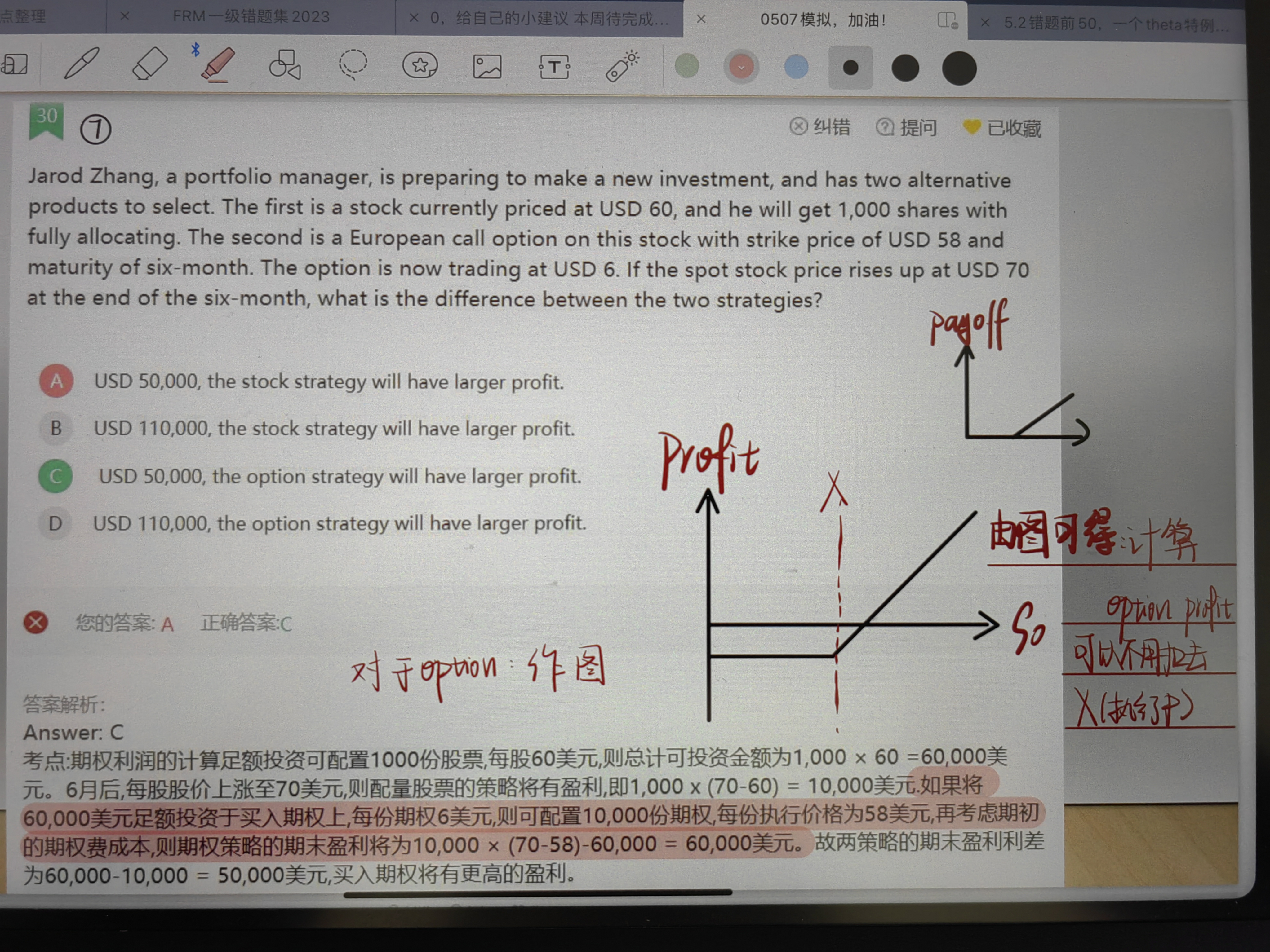 成本考虑了啊。首先题目告诉你,当前股价60,如果全部资金用于买股票,可以买1000份。所以总的可用资金就是60*1000,一份期权6块,那么如果所有的资金去买期权,一共可以买10000份,未来一份期权可以获取70-58的收益,一共有10000份期权,总收益是120000,减去买期权的成本60000,策略2一共是60000的收益。策略1的收益是10000,所以两个策略相差50000。