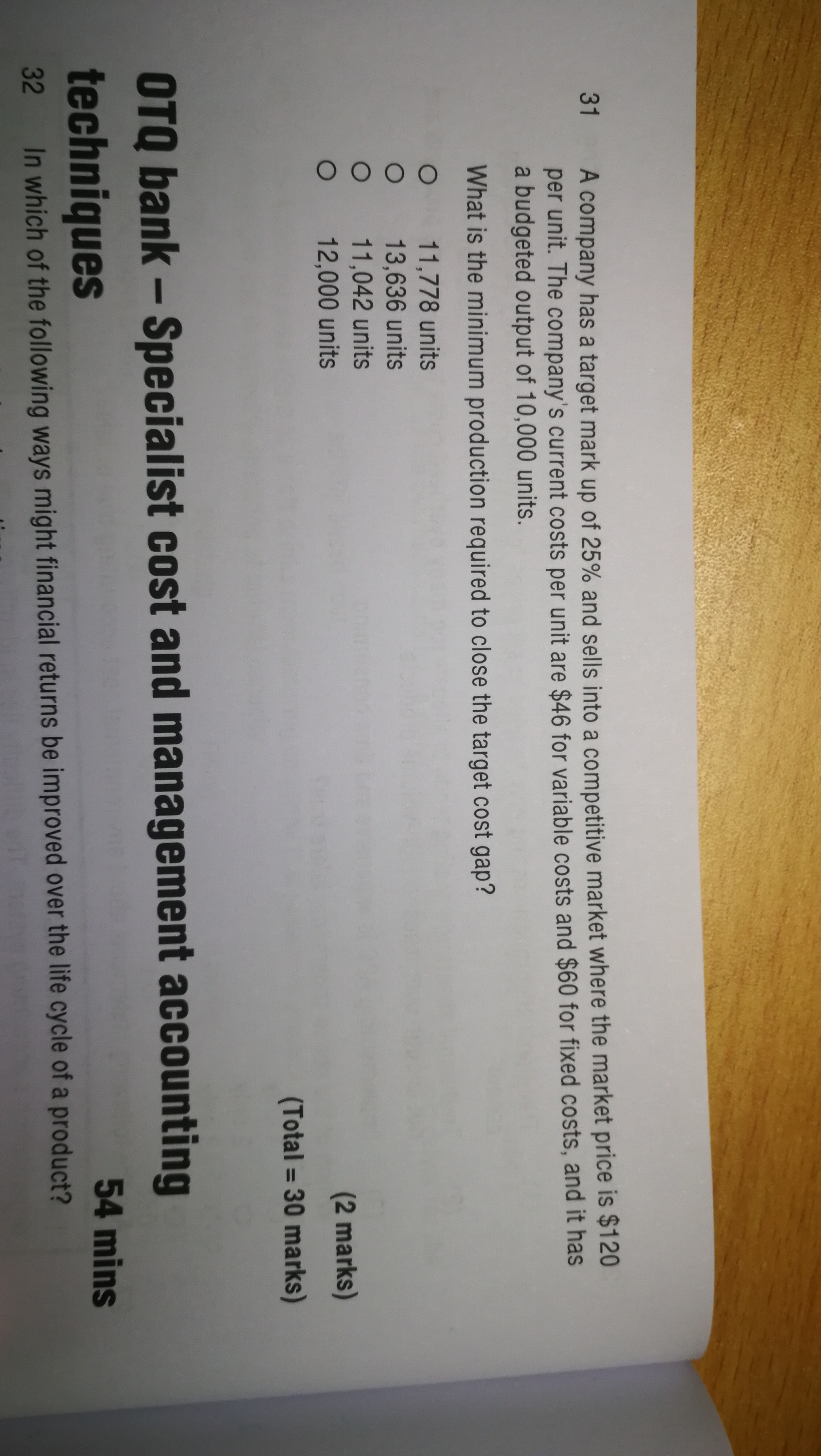 mark up=profit/cost=25%,所以cost/sales=100/125 固定成本是10000*60=600,000 total cost=46x+600k 所以(46x+600k)/120x=100/125 求出x=12000 注意固定成本是不变的