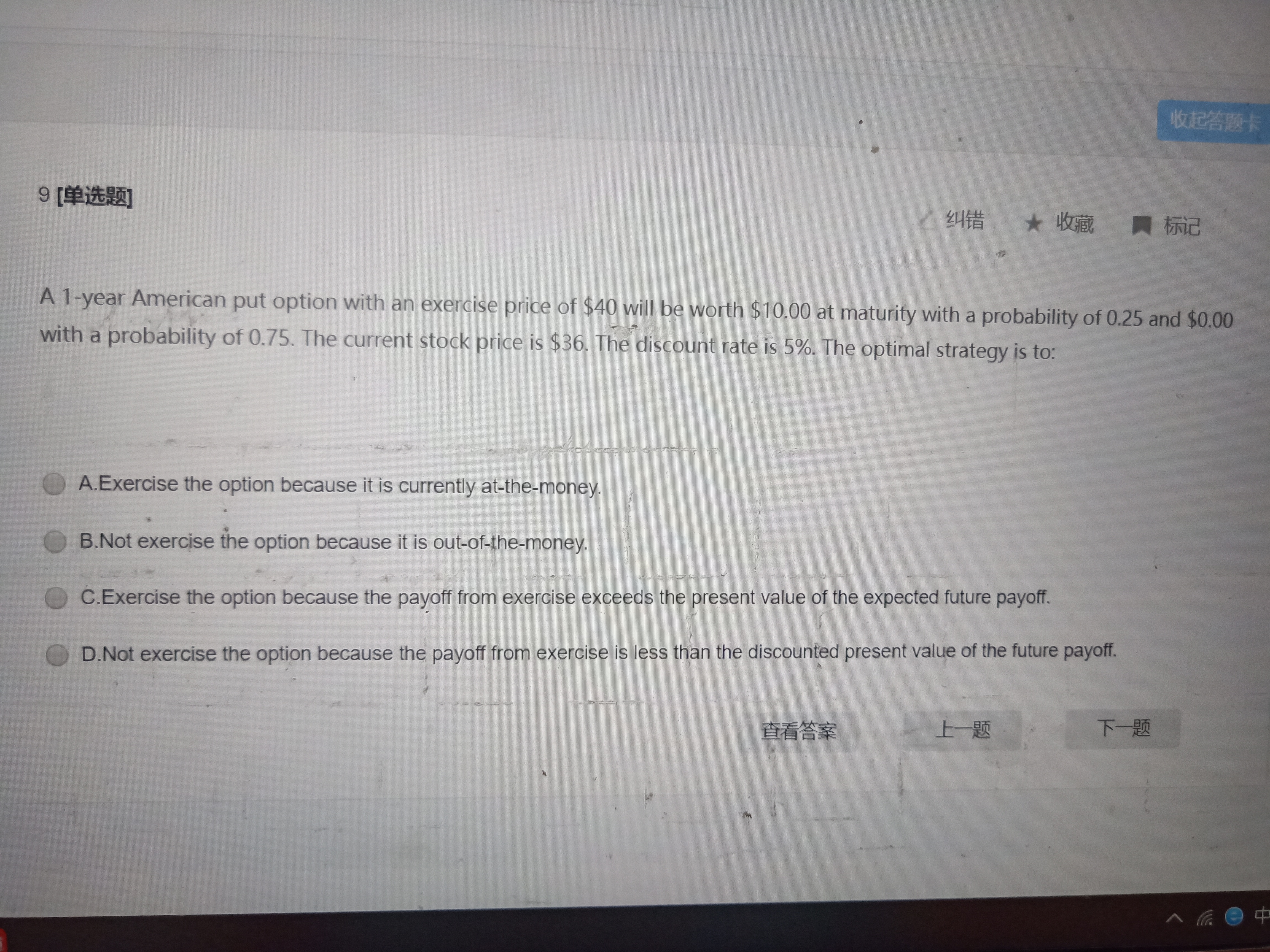 同学,美式期权可以提前行权,你到期期权有0.25的概率值10元,0.75的概率值0元,根据期望公式到期这个期权就可能值2.5元,用折现率折现到0时刻;再与0时刻提前行权的价格作比较,看提前行权收益大还是不提前行权收益大; 你先把网课看了再来做题目吧,这样没有效果