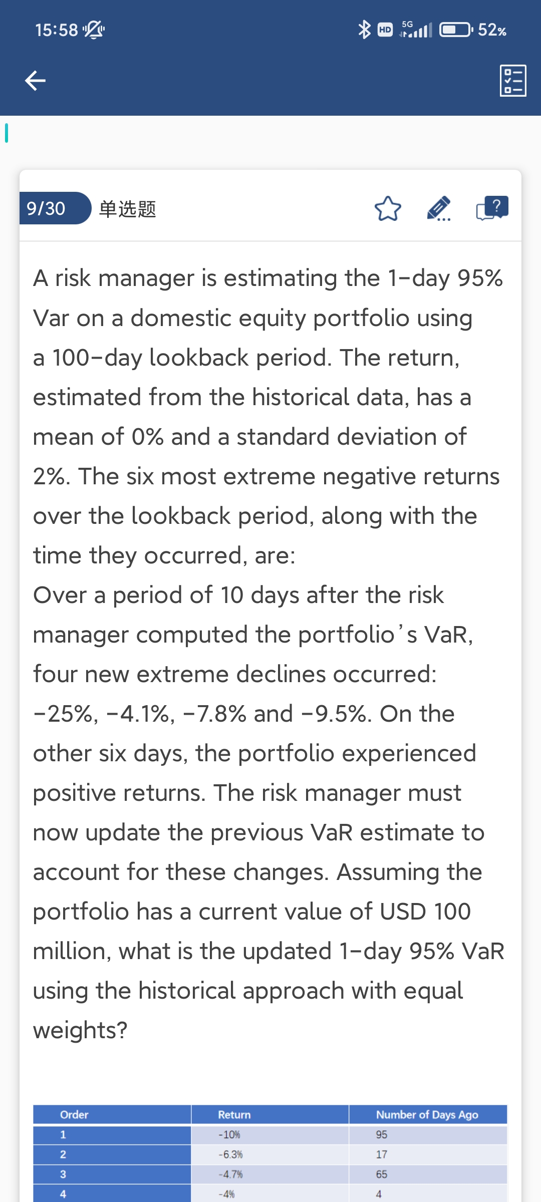 历史窗口期是100,也就是从现在开始往前数100天的数据,是计算VaR所使用的数据,等10天以后,原本表格里面95天前的数据,现在就变成了105天之前,就会掉出数据集,计算的时候就用不到这个数据