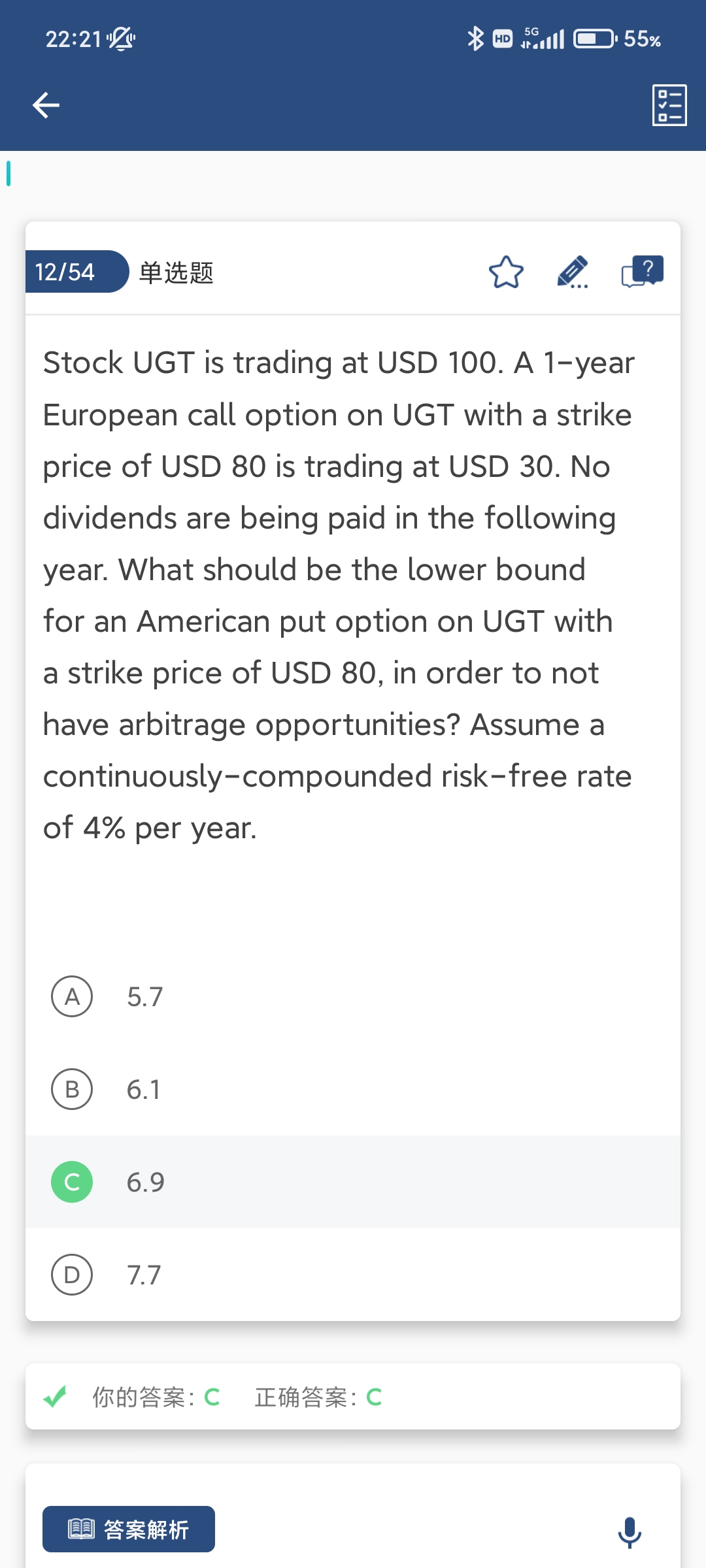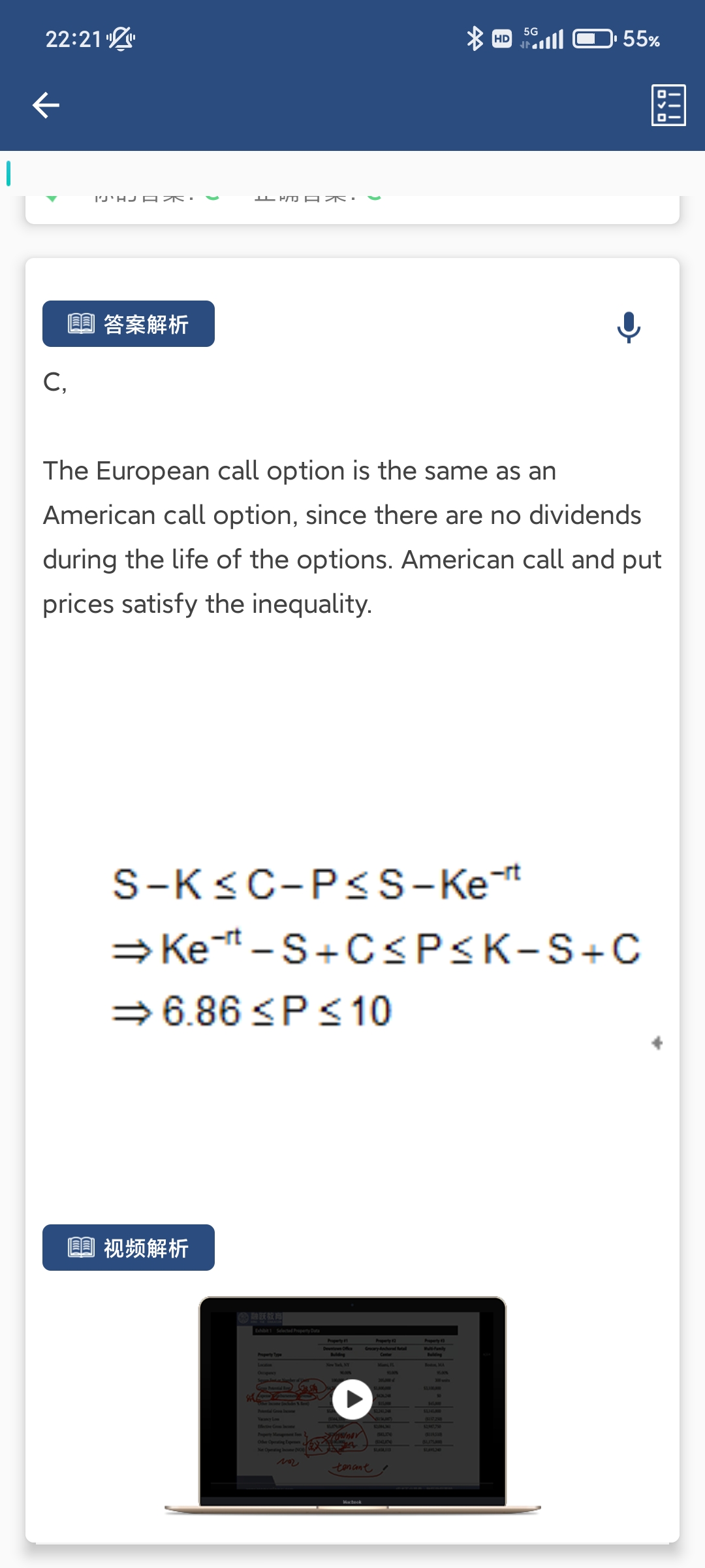 同学你好,题目让计算美式看跌期权的下限,通过计算出来的上下限区间选一个最接近下限的值是C选项,所以不选D。