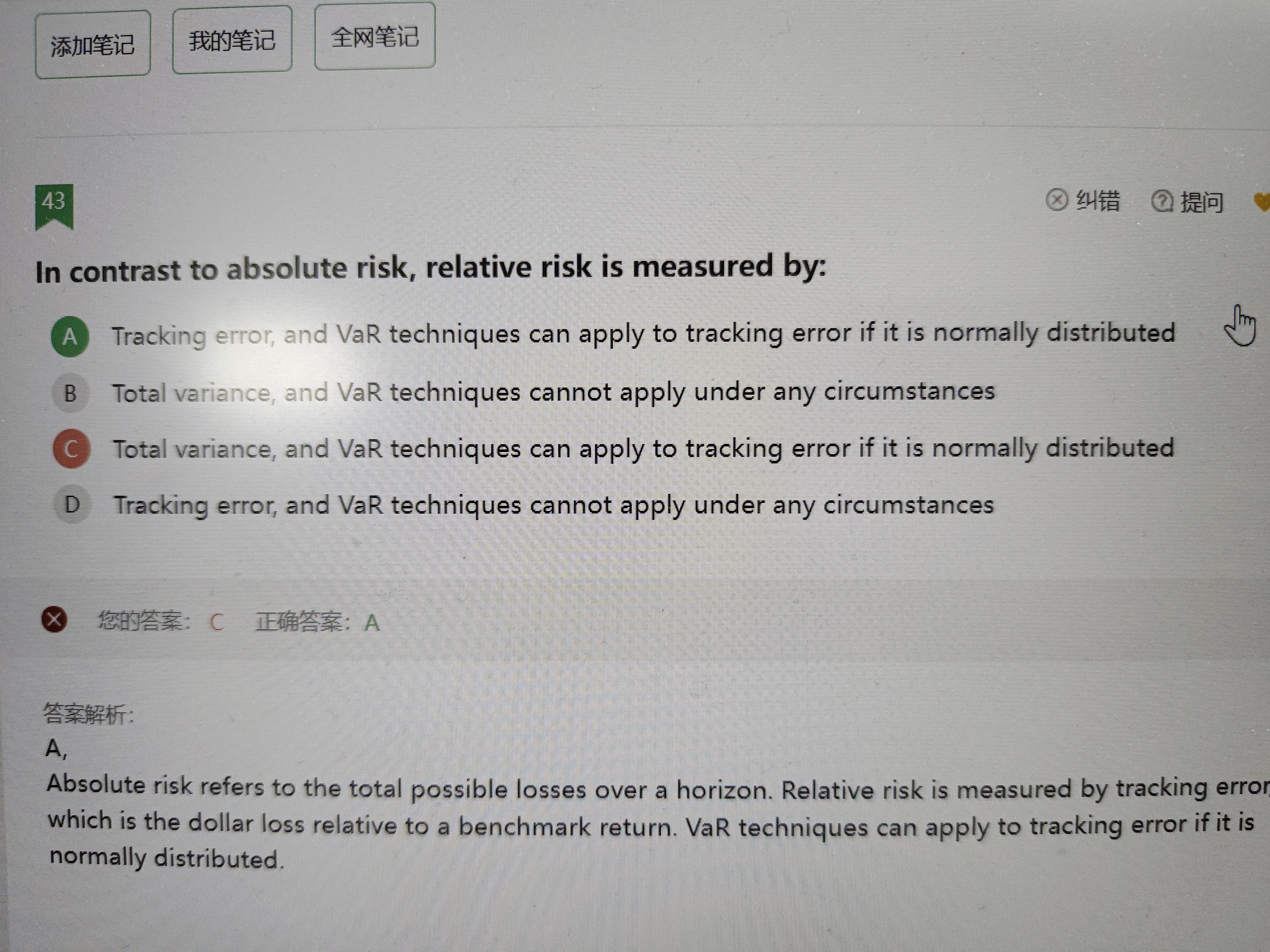 同学你好,这个知识点在投资风险风险预算章节有提到,绝对风险就是资产的总风险, 比如方差;相对风险就是资产相对于基准的风险,比如追踪误差;