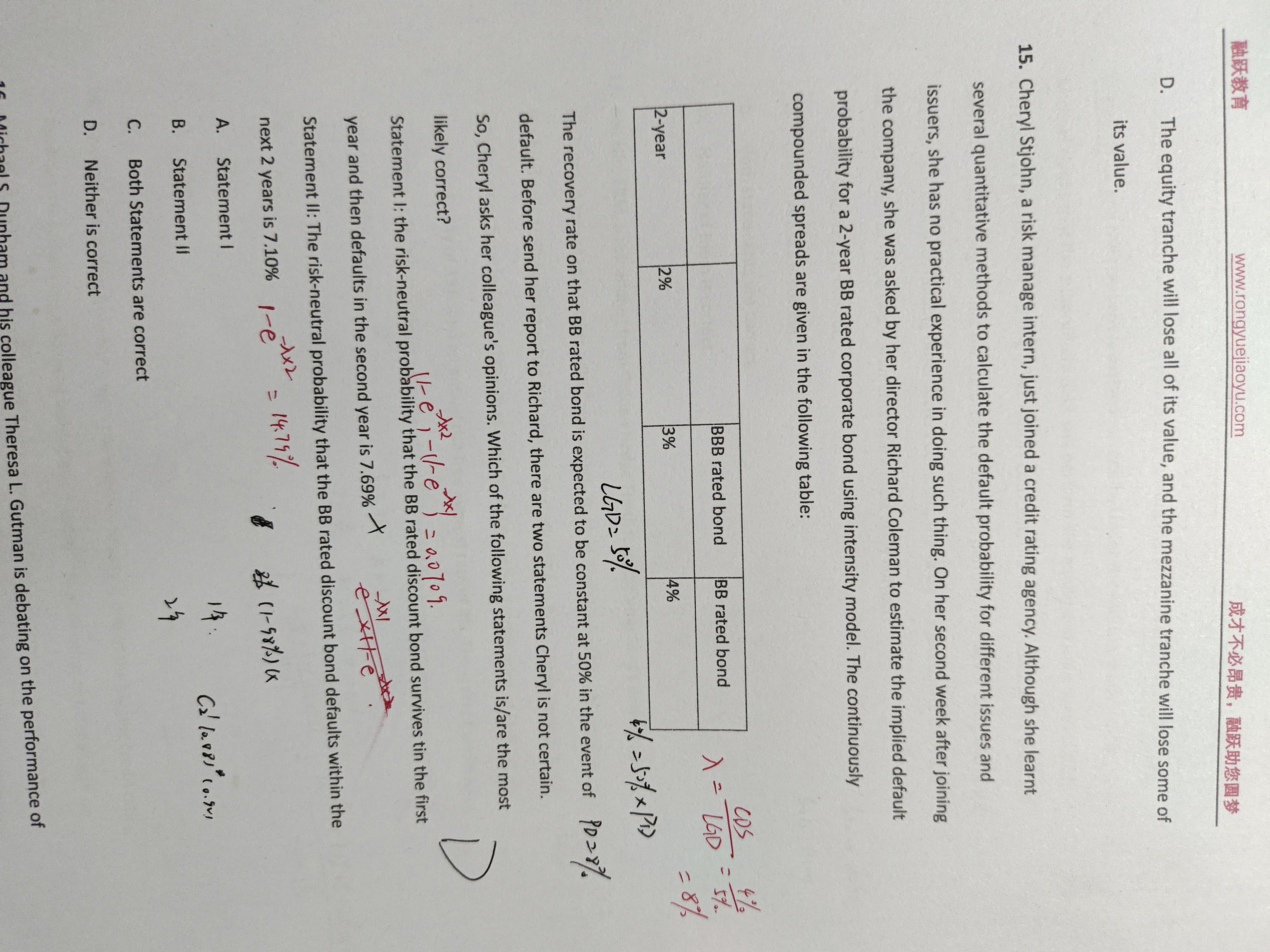 同学你好,第一个陈述其实是让计算联合/边际违约概率(关键词是and then)= 两年的累计违约概率—一年的累计违约概率。