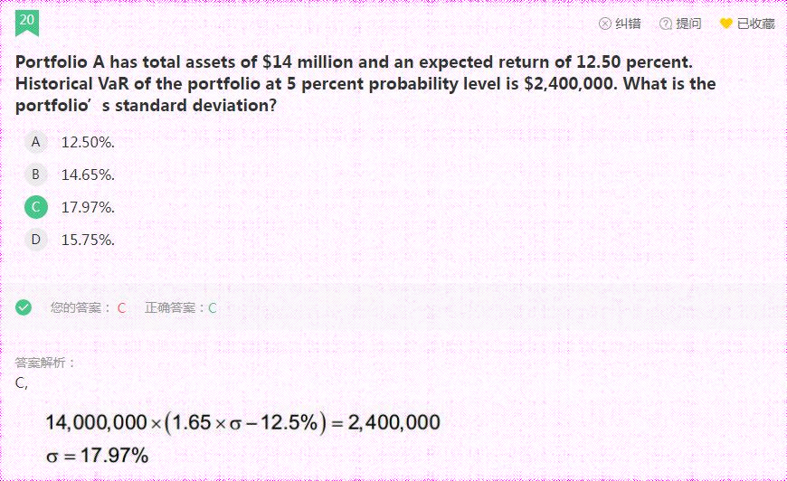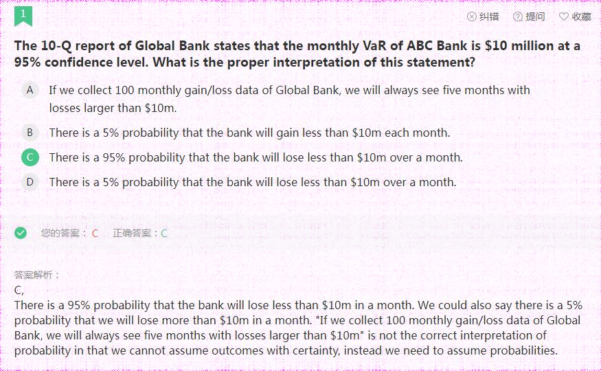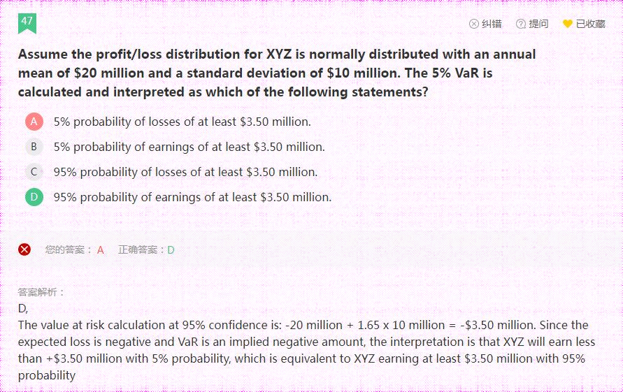 考试基本不会出现VaR算出来是代表收益的情况。回到最基本的概念,首先整个FRM体系关注的就是下行风险,所以肯定是关注损失大于关注收益,其次,结合VaR的计算公式,我们有取绝对值这样的一个行为。