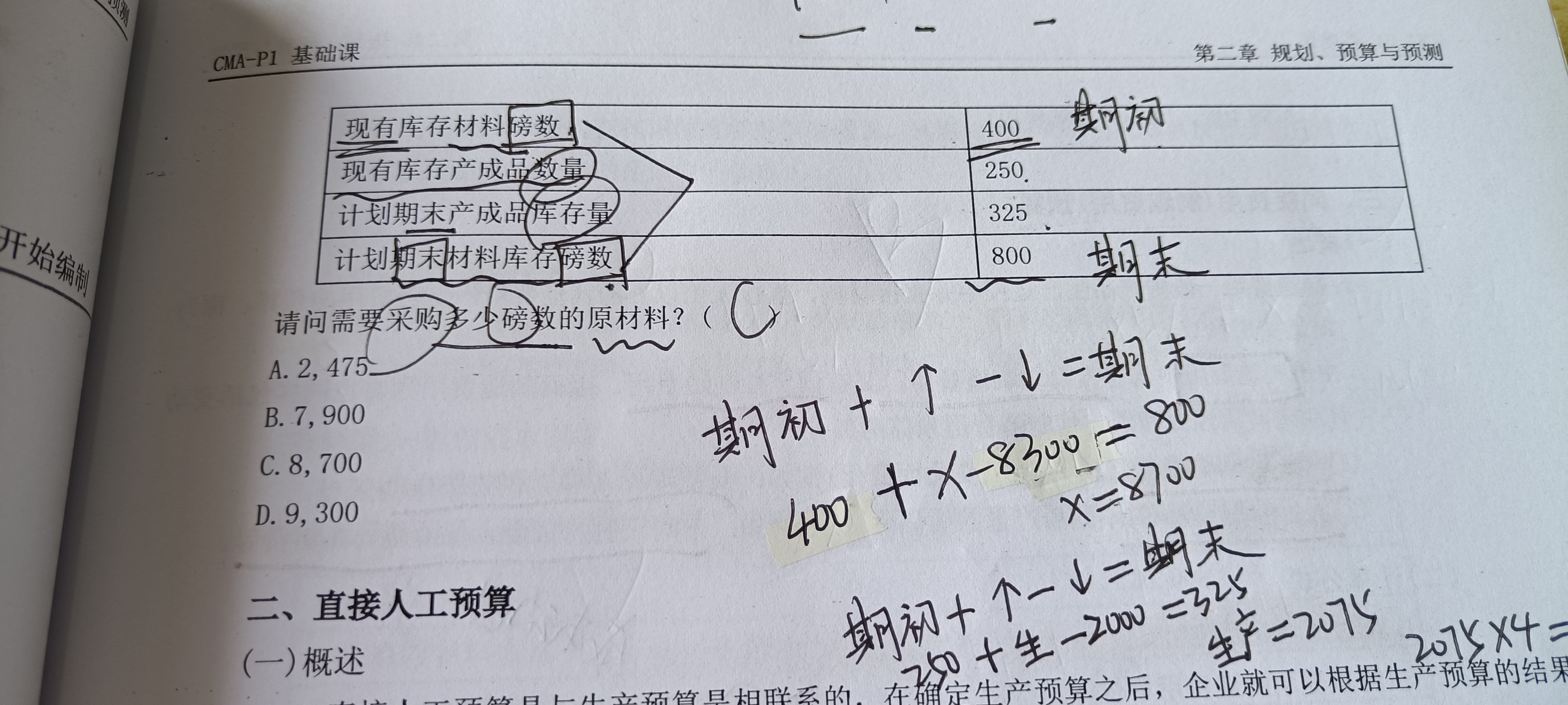 同学你好,这道题目需要先计算产成品的数量,再计算生产需要的原材料数量,之后才会计算原材料数量。本期需采购原材料数量=本期耗用数量+期末库存-期初库存。本期耗用数量=产成本本期使用数量=本期完工(销售)数量所耗用的+本期期末库存-期初库存。你所列的等式,在逻辑顺序上不对。